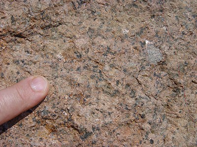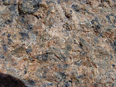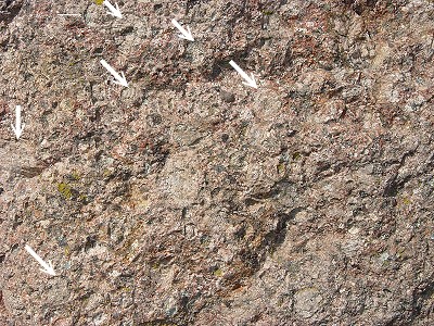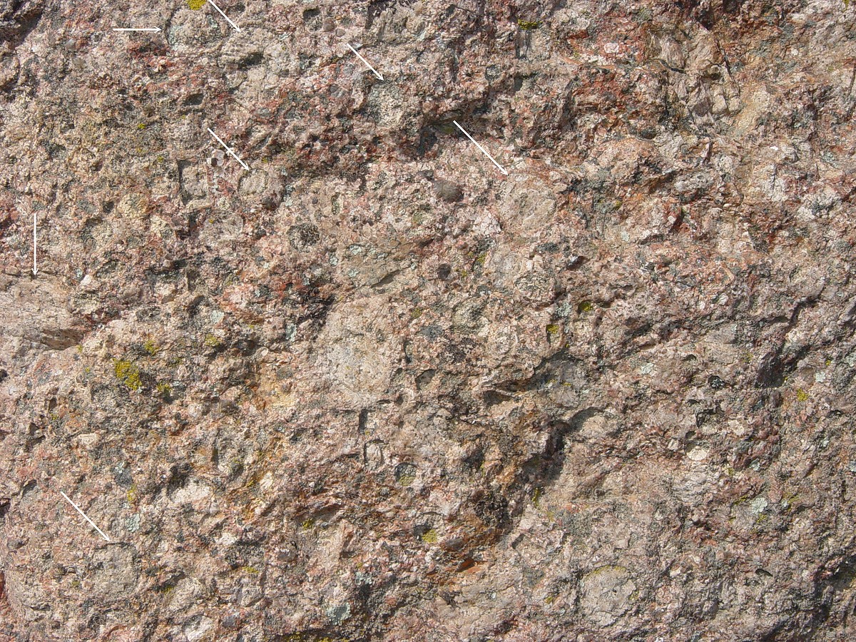 Die Ovoide sind nur bei genauem Hinsehen zu erkennen, da die Oberfläche trocken ist. Einige Feldspäte sind mit mehreren Zentimetern überraschend groß. Das ist in der Großaufnahme am besten zu sehen. | ||||||||||||||||||||||||||||||||||||||||||||||||||||||||||||||||||||||||||||||||||||||||||||||||||||||||||||||||||||||||||||||||