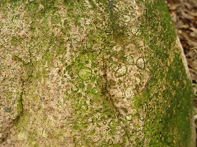Nahaufnahme mit Algen. Die Plagioklase verwittern schneller, daher vertiefen sich die Ringe. | ||||||||||||||||||||||||||||||||||||||||||||||||||||||||||||||||||||||||||||||||||||||||||||||||||||||||||||||||||||||||||||||||