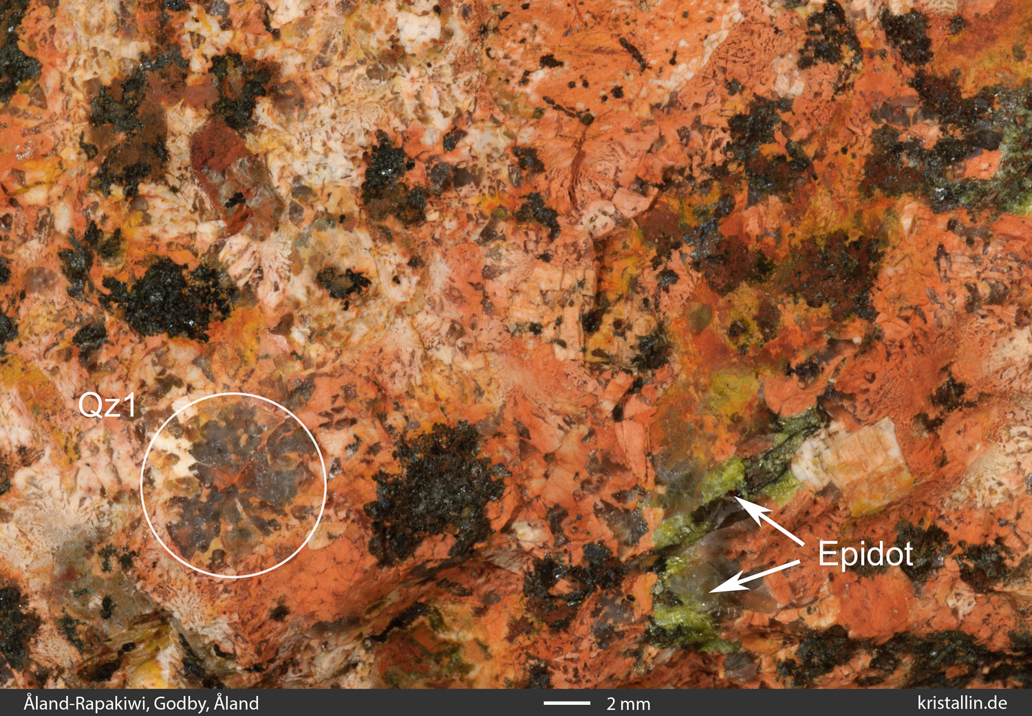 Das grüne Mineral ist Epidot, der oft in den roten Varianten der Rapakiwis