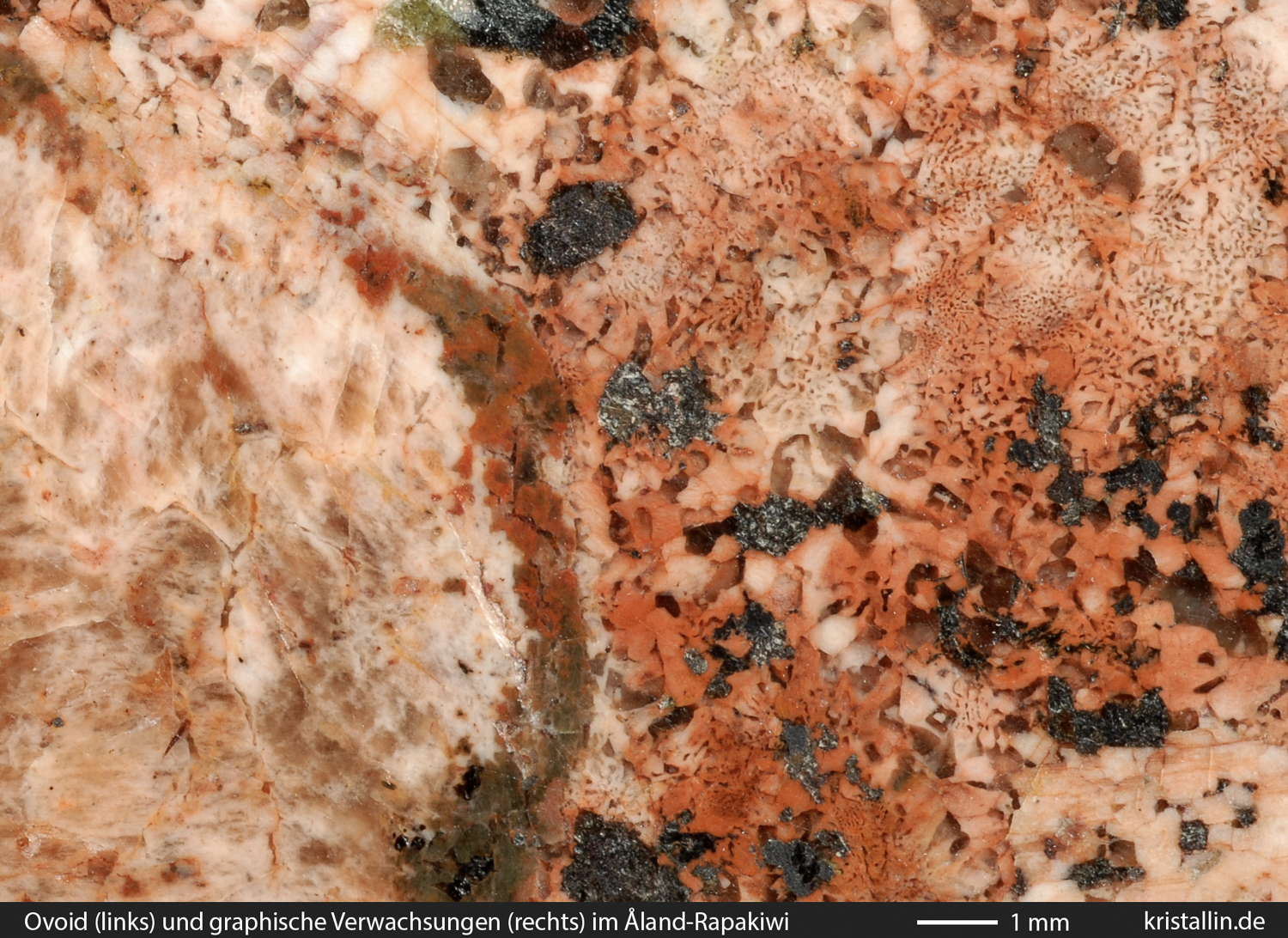 dieses Rapakiwis ist auffällig inhomogen. Der linke Ausschnitt zeigt