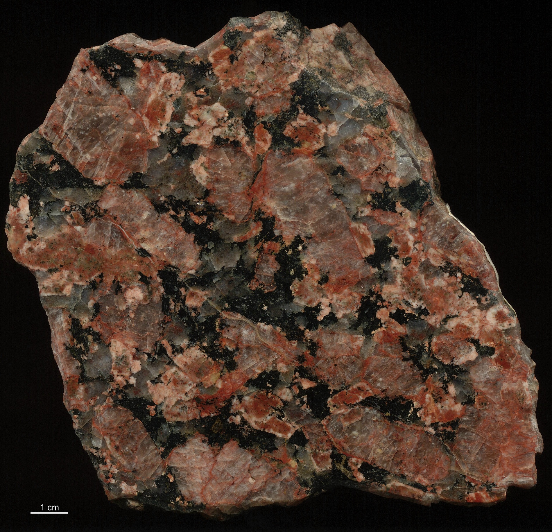 Ein eindrucksvolles, sehr grobkörniges Gestein, das aus Mengen großer Alkalifeldspäte inmitten einer schwarzen Masse besteht. Erst bei näherem Zusehen erkennt man den Quarz im Gestein, der milchig und hellgrau ist. Vereinzelt kommen auch schöne blaue Quarze vor. Die hier abgebildete Form des porphyrischen Graverfors-Granits wird durch die großen Alkalifeldspäte geprägt. Sie erreichen Größen von mehr als 6 cm, die meisten sind um 2- 4 cm groß. Oft sind sie als Karlsbader Zwillinge ausgebildet. Sie stecken in einer Masse aus schwarzem Biotit und anderen, makroskopisch nicht näher bestimmbaren dunklen Mineralen. Viele der großen Alkalifeldspäte sind von feinen roten Äderchen durchzogen. Der Plagioklas ist heller, oft blaßgelblich und teilweise nur spärlich enthalten. Das Mineral ist in Form kleiner Körner oder idiomorpher Kristalle ausgebildet. Einige Plagioklase gruppieren sich um die Außenseite der großen Kalifeldspäte, teilweise bilden sie Säume. Vollständige Säume kommen gelegentlich bei den kleineren Alkalifeldspäten vor. Das Gefüge des Granits ist meist undeformiert, gelegentlich aber auch etwas eingeregelt. Die Proben stammen aus der Gegend nördlich von Åby (östlich von Graverfors) bzw. direkt aus Graverfors. Das Granitmassiv ist mit knapp 10 km Durchmesser ziemlich klein. Es befindet sich nördlich von Norrköping und steckt als jüngerer Granit inmitten der svekofennischen Metamorphite. Auf der geologischen Karte ist an der rundlichen Form des Vorkommens schon zu erkennen, daß es sich um einen später eingedrungenen Granit handelt. Die Feldspäte sind in diesem Granit teilweise schwach deformiert. Die Spaltflächen haben keine ebenen, sondern leicht gewölbte und verbogene Oberflächen. Das Alter des Graverfors-Granits liegt bei knapp 1830 Millionen Jahren. | |||||||||||||||||||||||||||||||||||||||||||||||||||||||||||||||||||||||||||||||