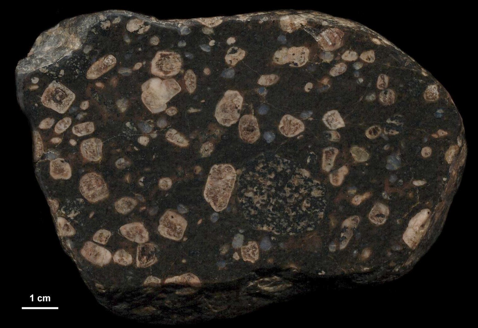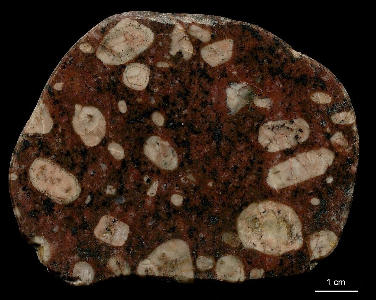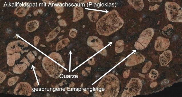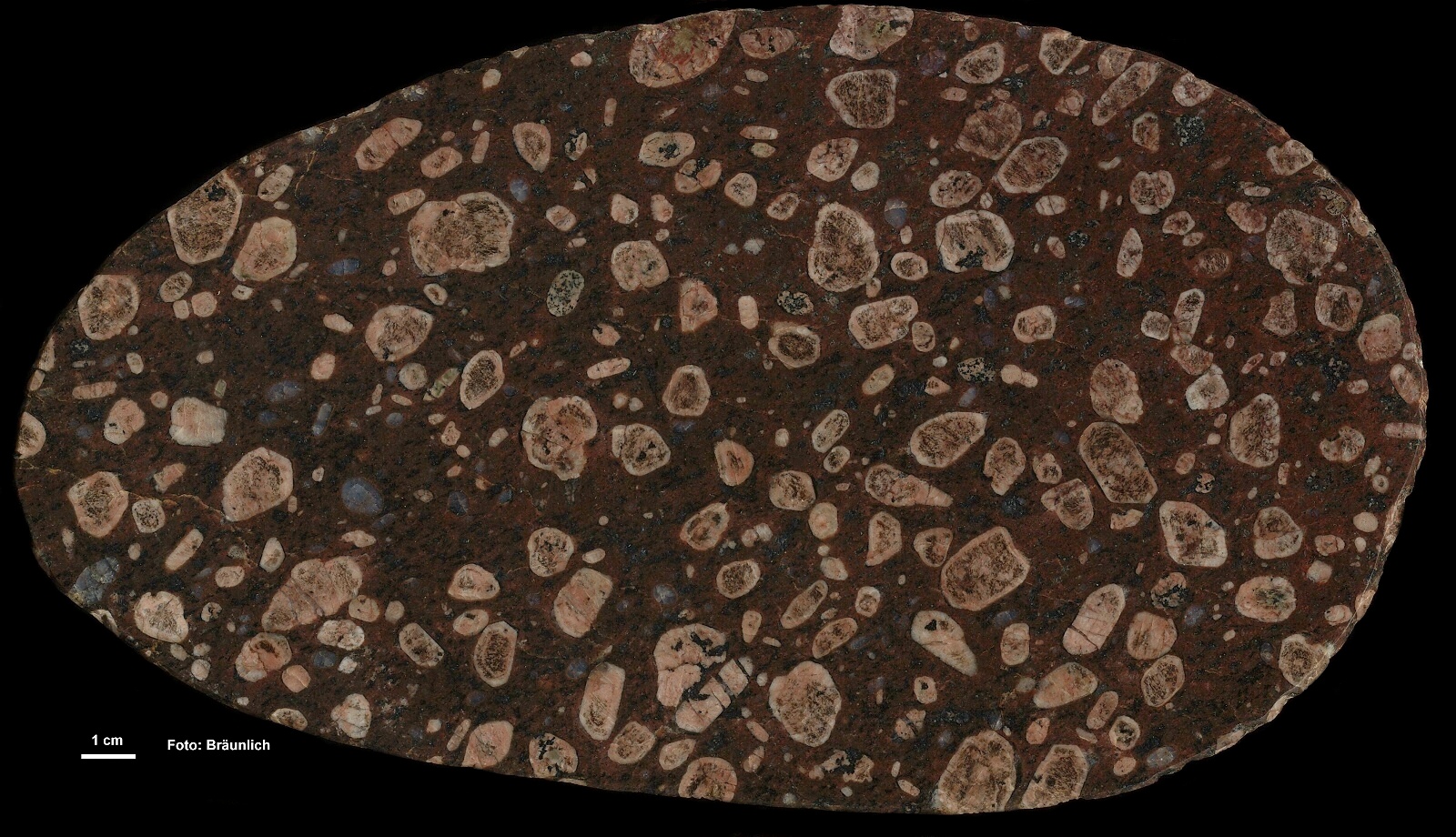 Ein ausgesprochen hübsches Gestein. Auffällig sind die gerundeten Kalifeldspat-Einsprenglinge. Sie sind hell und heben sich schön von der meist braunen, gelegentlich sehr dunklen Grundmasse ab. Benannt ist dieses Gestein nach der kleinen Ortschaft Påskallavik an der südschwedischen Ostküste, unweit von Oskarshamn. "Påskallavik-Porphyr" sollte man nicht als Bezeichnung eines einzigen konkreten Vorkommens verstehen. Es gibt in Småland, besonders im Osten, viele Porphyre, die dieses Gefüge in verschiedenen Varianten zeigen. Im Ort Påskallavik findet sich aber auch ein solcher Porphyr anstehend (am westlichen Straßenrand) sowie ein schöner, mehrere Meter breiter Gang unmittelbar nördlich des Ortes, noch vor der Hauptstraße. Dort kann man den Kontakt zum umgebenden Granit sehr schön studieren, allerdings ist dort das Gefüge nicht ganz so hübsch wie hier auf den Fotos. Alle diese Porphyre zeichnen sich durch eine granitische Zusammensetzung aus. Neben den hellen Alkalifeldspäten findet sich regelmäßig Quarz, der oft schön blau ist. Die Einsprenglinge sind mit etwa 1- 2 cm schon recht groß und zeigen gelegentlich eine Zonierung, d.h. es sind Anwachssäume aus Plagioklas um den Alkalifeldspat zu erkennen. Manchmal sind die Körner durch Belastung gesprungen. Es gibt in der Regel nur Alkalifeldspat-Einsprenglinge. Geschiebe von der Ostsee (Brodtener Ufer), polierter Schnitt: | |||||||||||||||||||||||||||||||||||||||||||||||||||||||||||||||||||||||||||||||