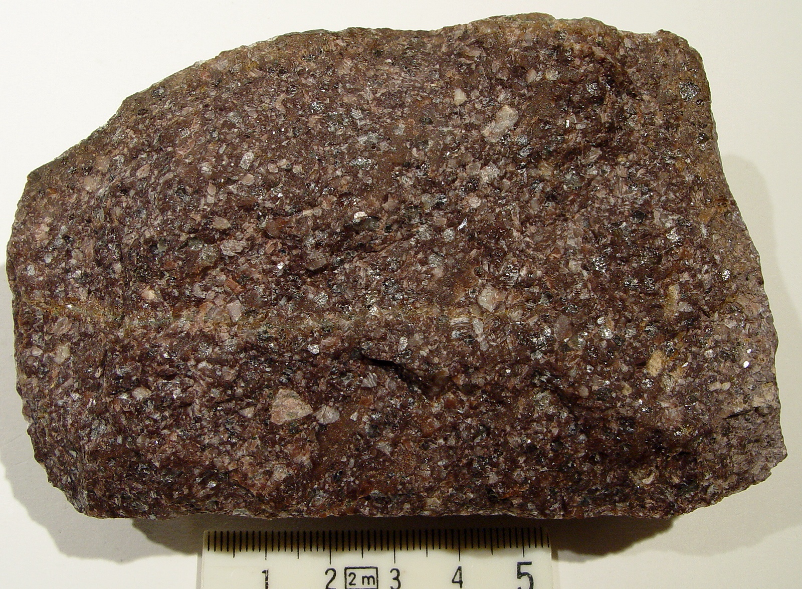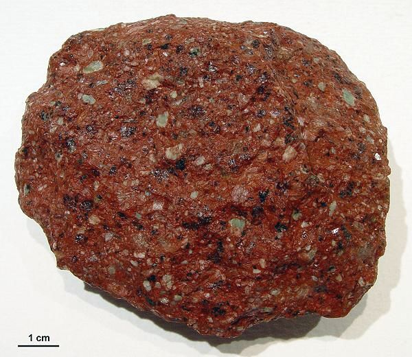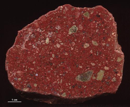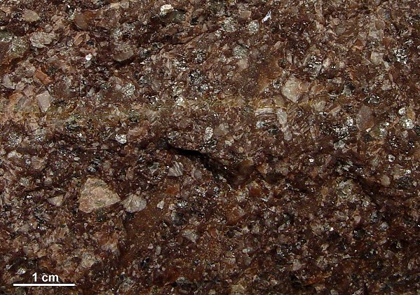 Einige wenige Porphyre aus Dalarna führen Quarz in nennenswerter Menge. Für die Geschiebekunde ist das natürlich sehr willkommen, ist Quarz doch ein "von Hand" leicht zu bestimmendes Mineral. Der Särna-Quarzporphyr tritt in einer roten und einer violetten Form auf. Die violette enthält tendenziell mehr Einsprenglinge und kann zusätzlich noch als Ignimbrit ausgebildet sein. Ignimbrite entstehen bei Vulkanausbrüchen. Sie sind das Ablagerungsprodukt heftiger, explosiver Ausbrüche. Die im Gefüge der Porphyre erkennbaren, leicht welligen Streifen sind flachgedrückte, ehemalige Bimssteinfladen. Zuerst jedoch der rote Särna-Quarzporphyr. Die Probe stammt aus dem Anstehenden im Norden Dalarnas (Kreuzung der Straßen 70 und 111) und wurde mir von Jan Kottner überlassen. | ||||||||||||||||||||||||||||||||||||||||||||||||||||||||||||||||||||||||||||||||