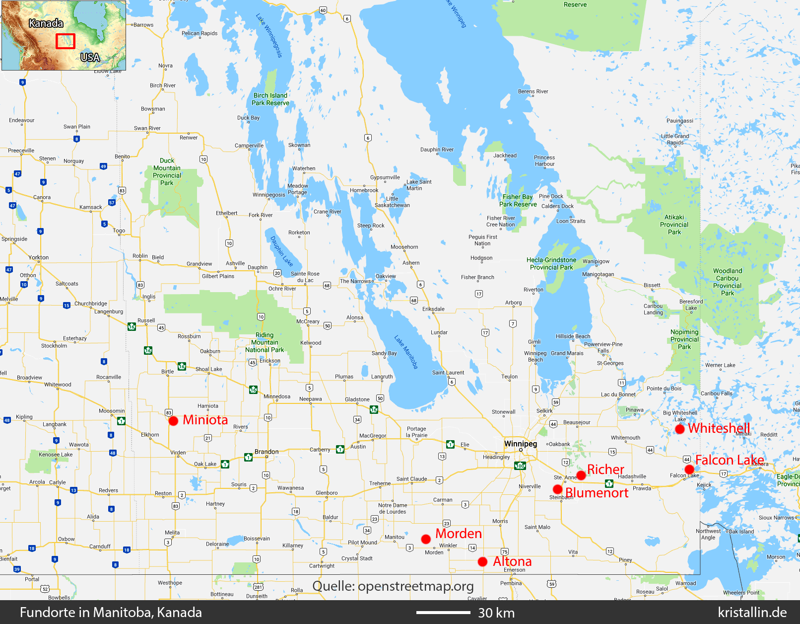 So wie Norddeutschland komplett von Eis bedeckt war, so war es auch hier in Manitoba. Deshalb gibt es reichlich eiszeitliche Ablagerungen, die in diversen Kiesgruben als Sand und Kies abgebaut werden. Dabei kommen immer wieder auch große Findlinge ans Licht. Leider landen die alle im Brecher und werden zu Schotter verarbeitet. Das schmerzt, denn darunter sind schöne und seltene Stücke, die jedes Museum sofort ausstellen würde.
