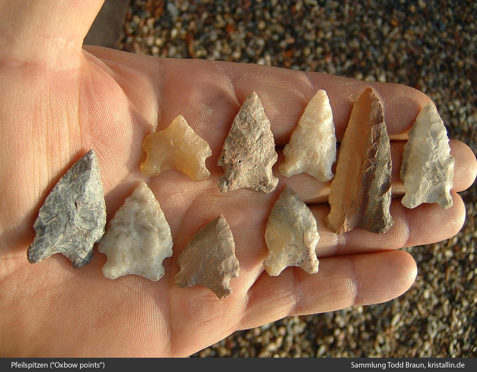 Über die Jahre hinweg hat Todd eine Menge solcher Pfeilspitzen („arrow points“) gefunden. Die auf seiner Handfläche bezeichnet man nach einem Fundort in Saskatchewan als „Oxbow points“.