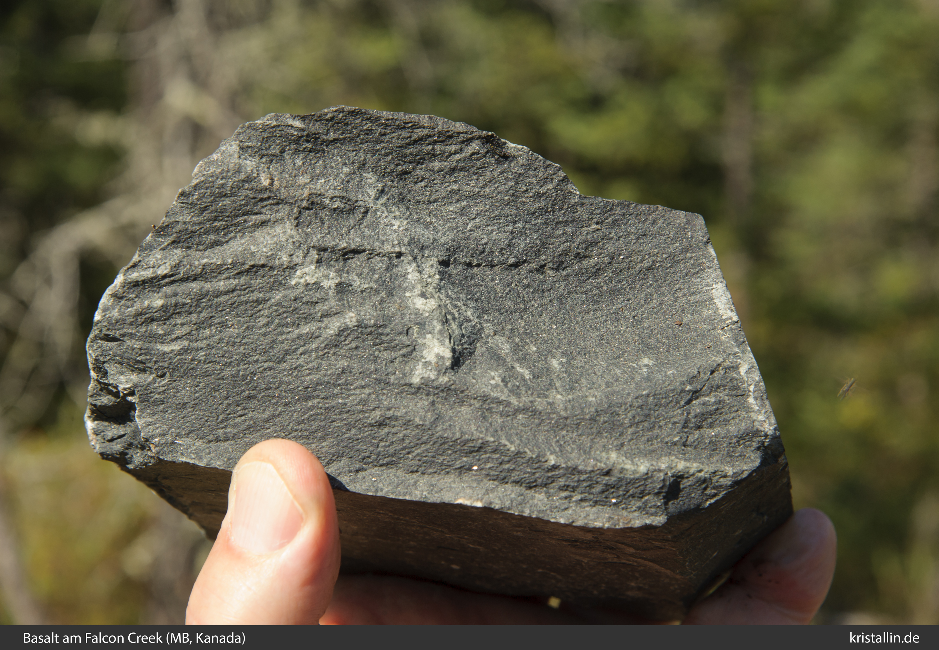 Auf einer Nebenstraße geht es weiter nach Osten, zum West Hawk Lake. Unterwegs treffe ich wieder auf anstehendes Gestein, das diesmal keine Kissenlava ist, sondern feinkörnig, schwarz und voller winzig kleiner, glitzernder Minerale.