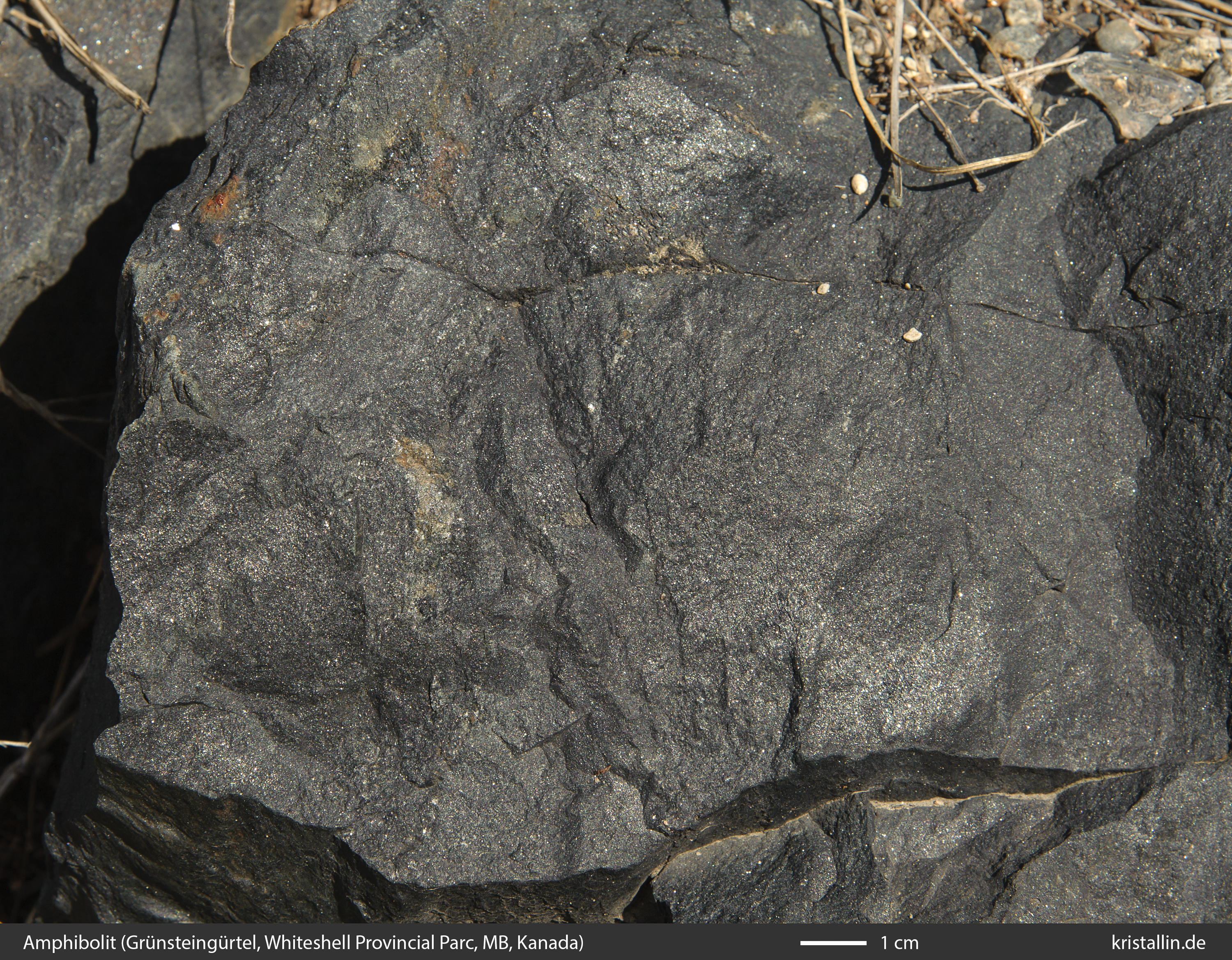 Da es ein dunkles Gestein ist, bin ich noch im Grünsteingürtel. Das ist aber kein Basalt mehr, denn der würde nicht glitzern. Das sieht viel mehr nach einem Amphibolit aus, denn intensiv spiegelnde Minerale bedeuten gute Spaltbarkeit und das kann bei diesem Schwarz eigentlich nur Amphibol sein. Wir haben hier ein Beispiel für Amphibolitfazies in einem Grünsteingürtel.