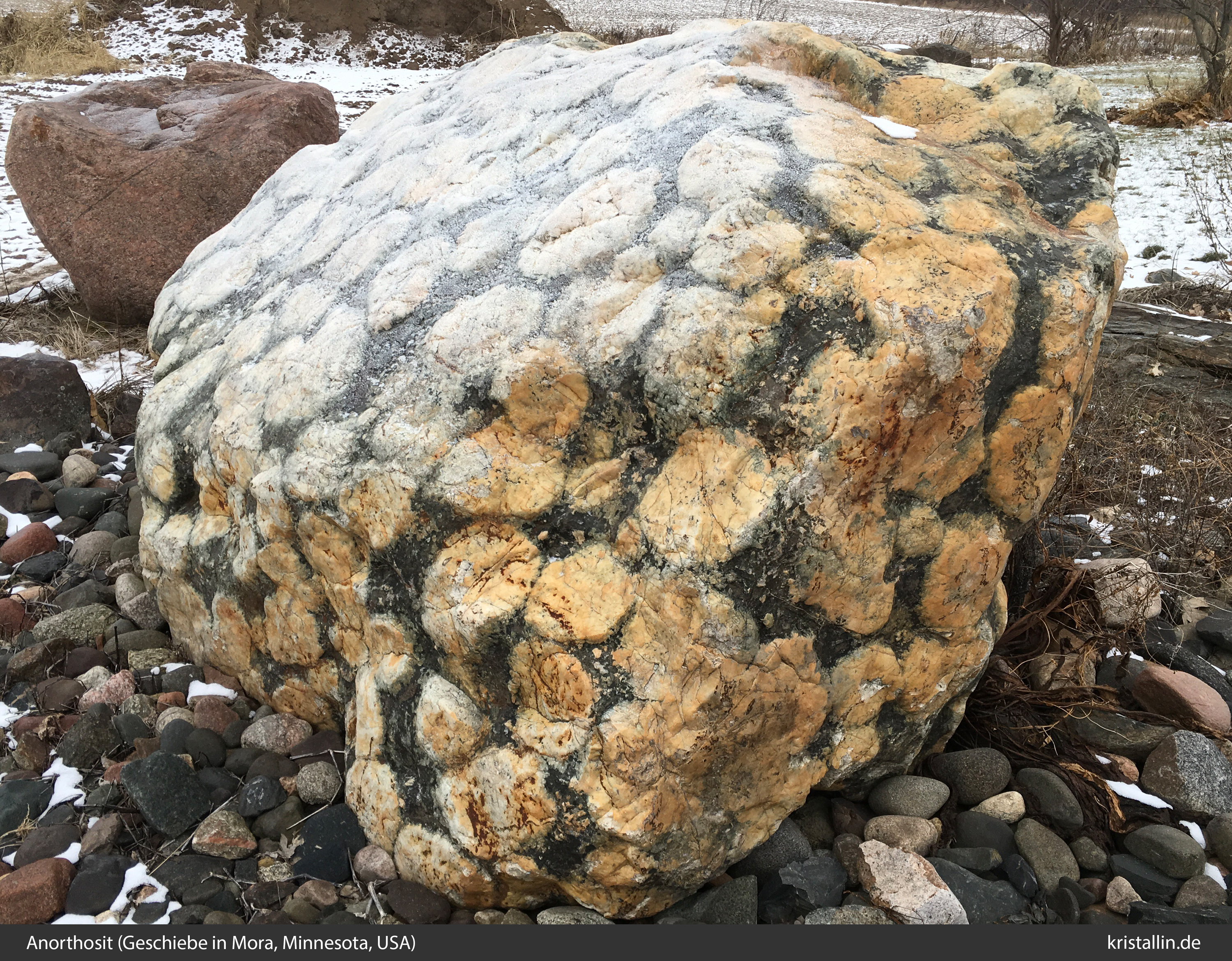 Solche riesenkörnigen Anorthosite wurden mehrfach als Geschiebe gefunden und es sind auch ähnliche Vorkommen im Grundgebirge bekannt. (Dazu gibt es einen lesenswerten Text.)