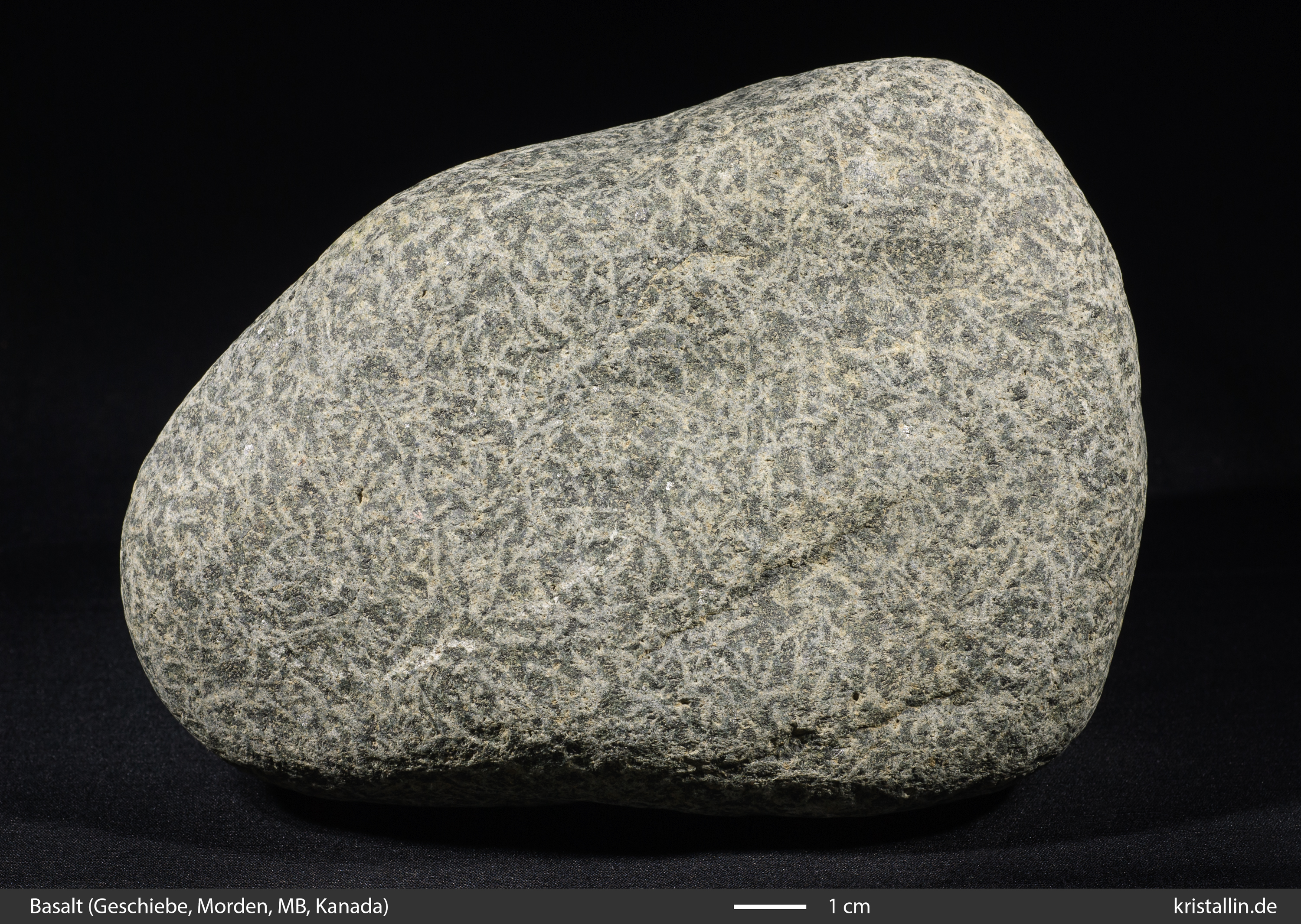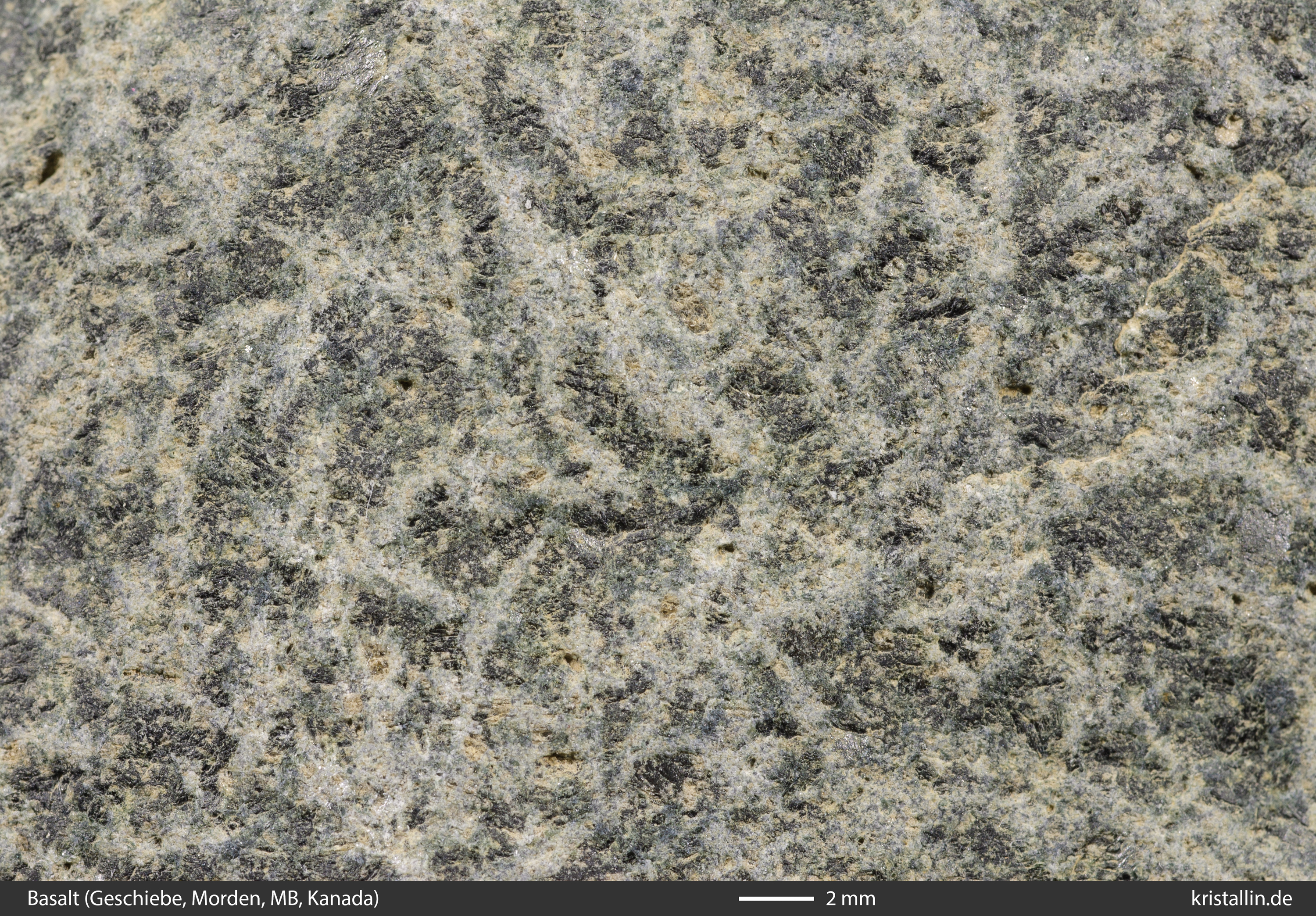 Ein zweites Gestein mit offenen Fragen wurde bereits mikroskopiert und als Basalt bestimmt (unten). Was es aber mit dem auffälligen Muster auf sich hat, wissen wir noch nicht.