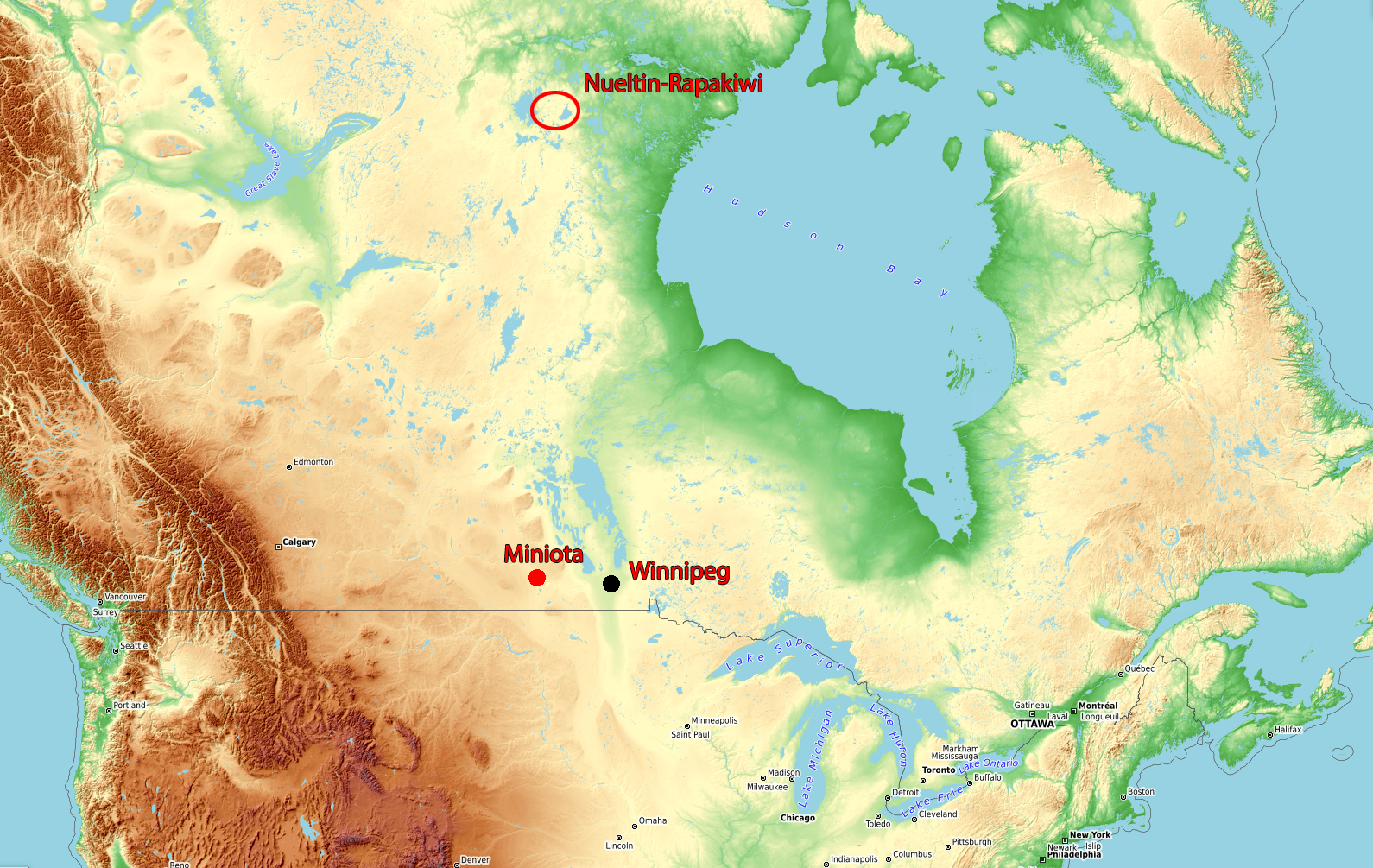 Diese Granitporphyre stammen aus dem Nueltin-Rapakiwi, der weit im Norden Manitobas liegt (Karte). Er ist einer der wenigen Rapakiwis in Kanada und gehört zur „Dubawnt Supergroup“. Mit einem Alter von 1,75 Milliarden Jahren ist er jünger als die umgebenden Gesteine. Auch darin gleicht er den Rapakiwis in Skandinavien.