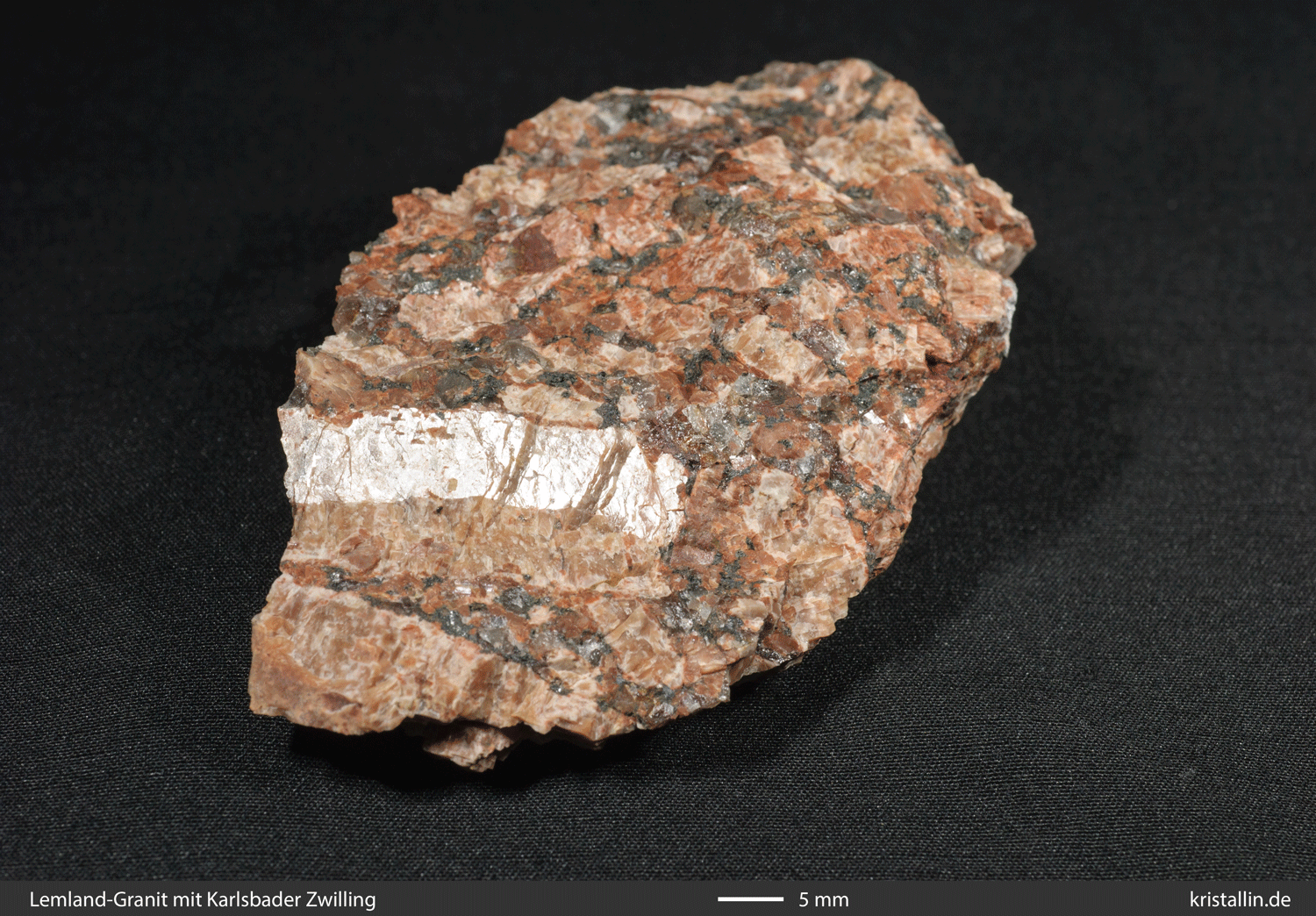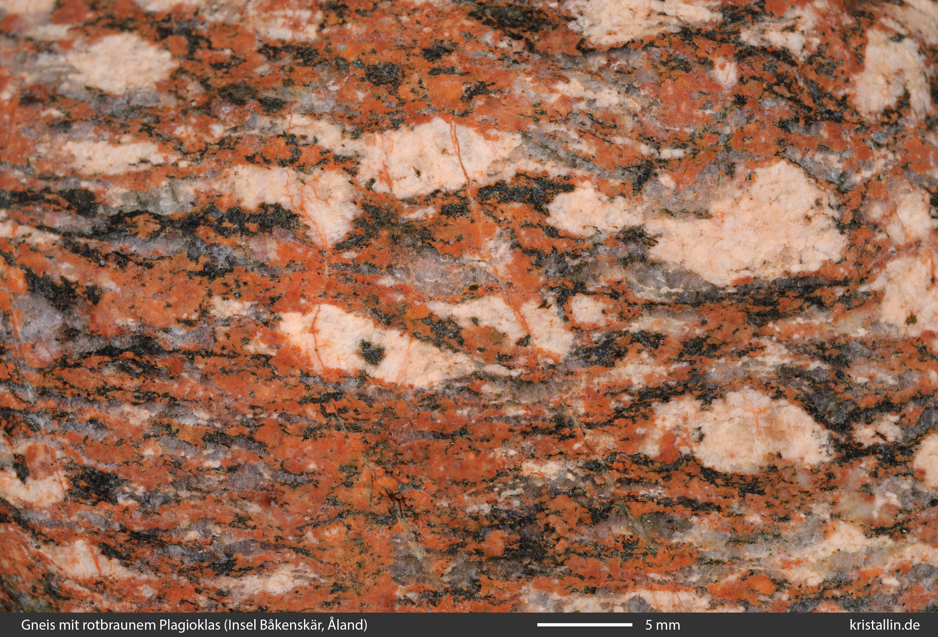 - Der zweite Feldspat ist braunroter oder brauner Plagioklas, dessen Kristalle dunkler und kleiner sind als die Alkalifeldspäte. Die für Plagioklas typischen Zwillinge sind nur selten erkennbar. Im Gelände erkennt man den Alkalifeldspat an seinen perthitischen Entmischungen und an den Karlsbader Zwillingen. Plagioklas ergibt sich dann als zweiter Feldspat.