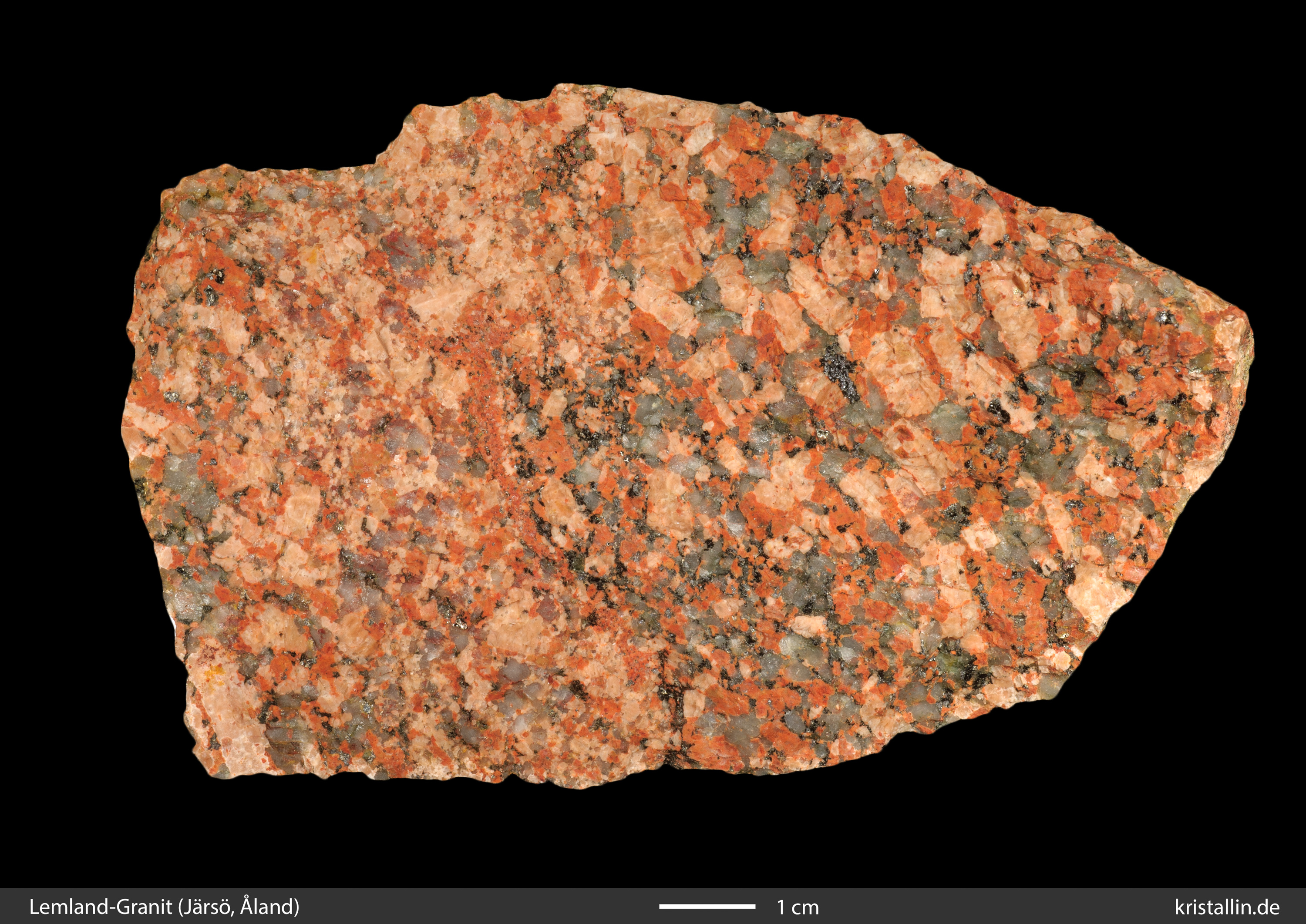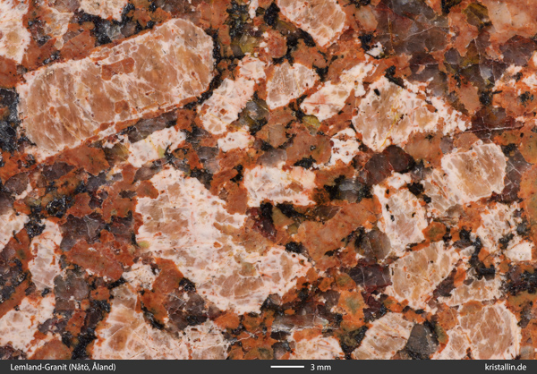Die dunkelbraunen Plagioklase neben den hellen, länglich-rechteckigen Alkalifeldspäten sind typisch für diesen Granit. Wenn auch die Form der Quarze beachtet wird, ist der porphyrische Lemland-Granit ein leicht zu bestimmendes und verlässliches Leitgeschiebe für das südliche Åland.