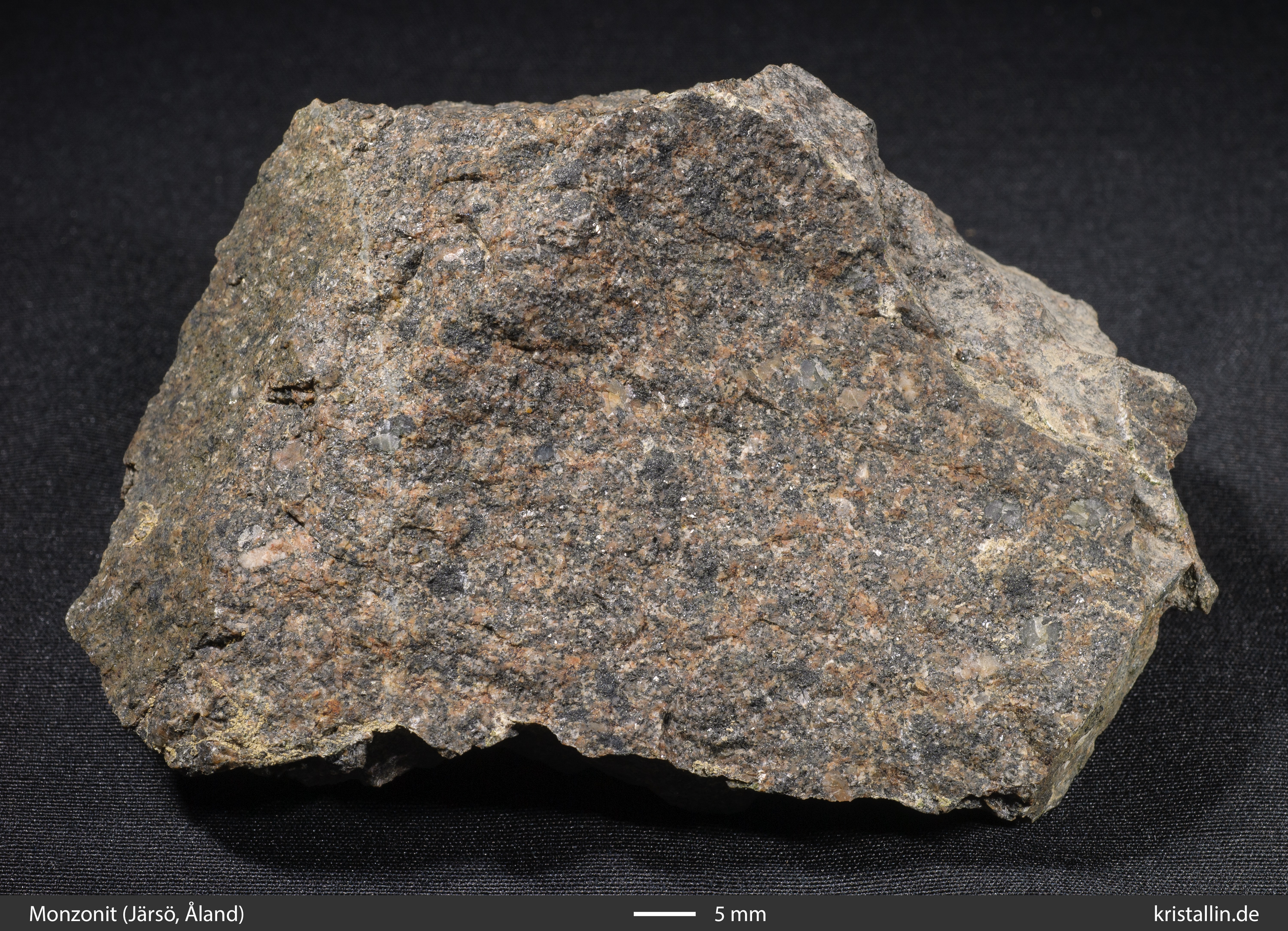 Dieses Gestein ist fein- bis mittelkörnig, braun oder graubraun. Besondere Eigenschaften sind makroskopisch nicht erkennbar. Da es ähnliche Gesteine mehrfach in Skandinavien gibt, ist dieser Monzonit ohne Labor nicht zu bestimmen. Für die Geschiebekunde spielt er keine Rolle.