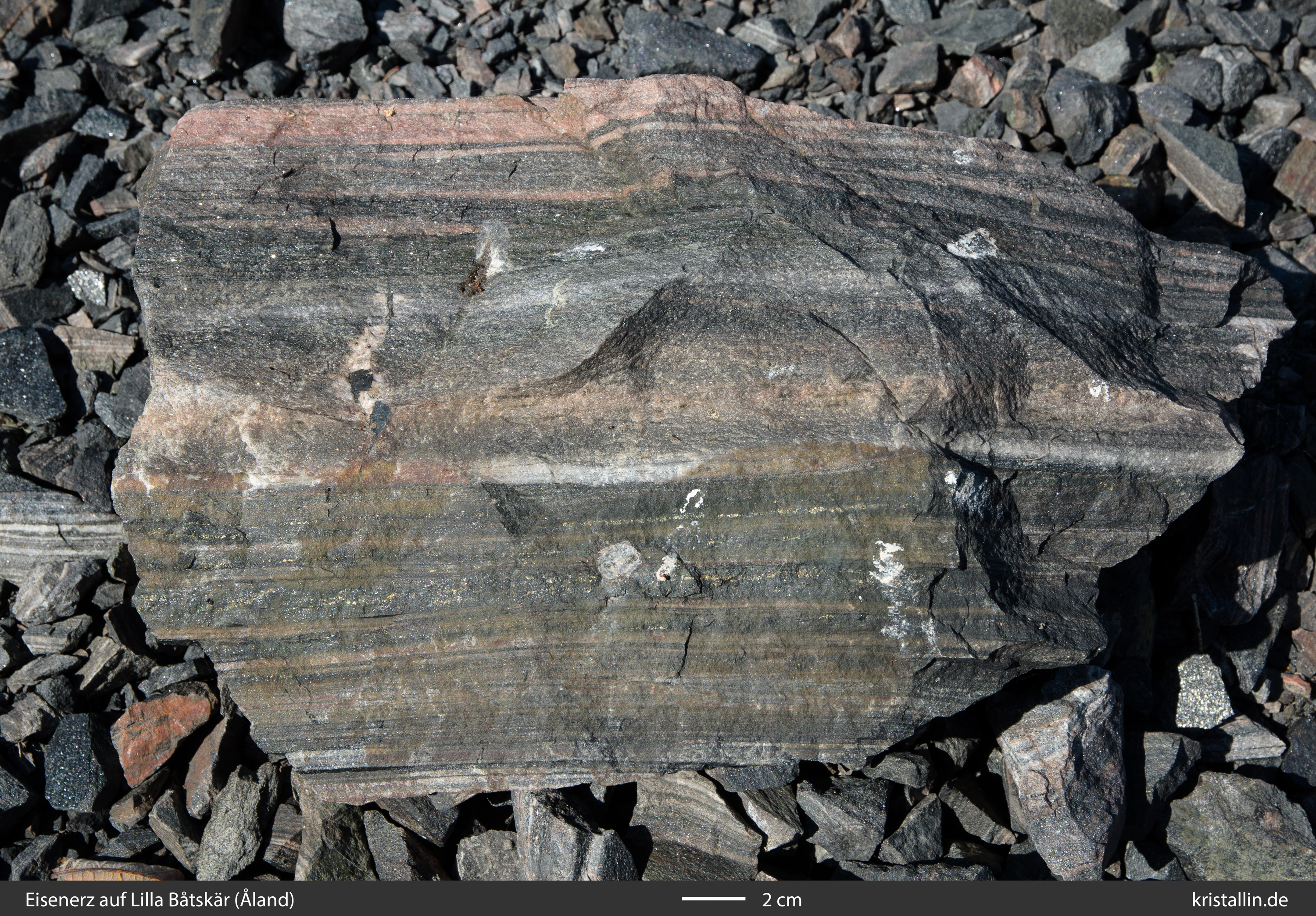 Auf der Insel liegen noch heute Reste vom schwarzen Eisenerz (unten). Das gebänderte Gestein steckt voller Magnetit und hat eine hohe Dichte.