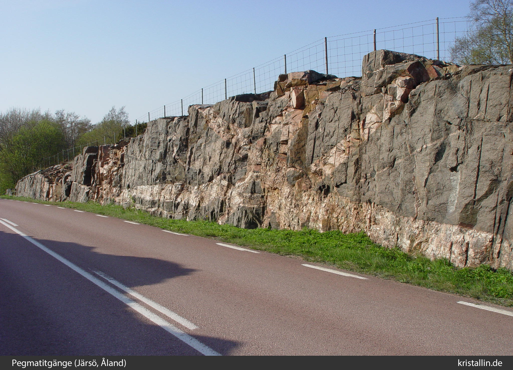 Auf Järsö gibt es einen großen Straßenaufschluss, in dem sich Pegmatitgänge unterschiedlichen Alters durchkreuzen. Sie alle stecken im Monzonit.