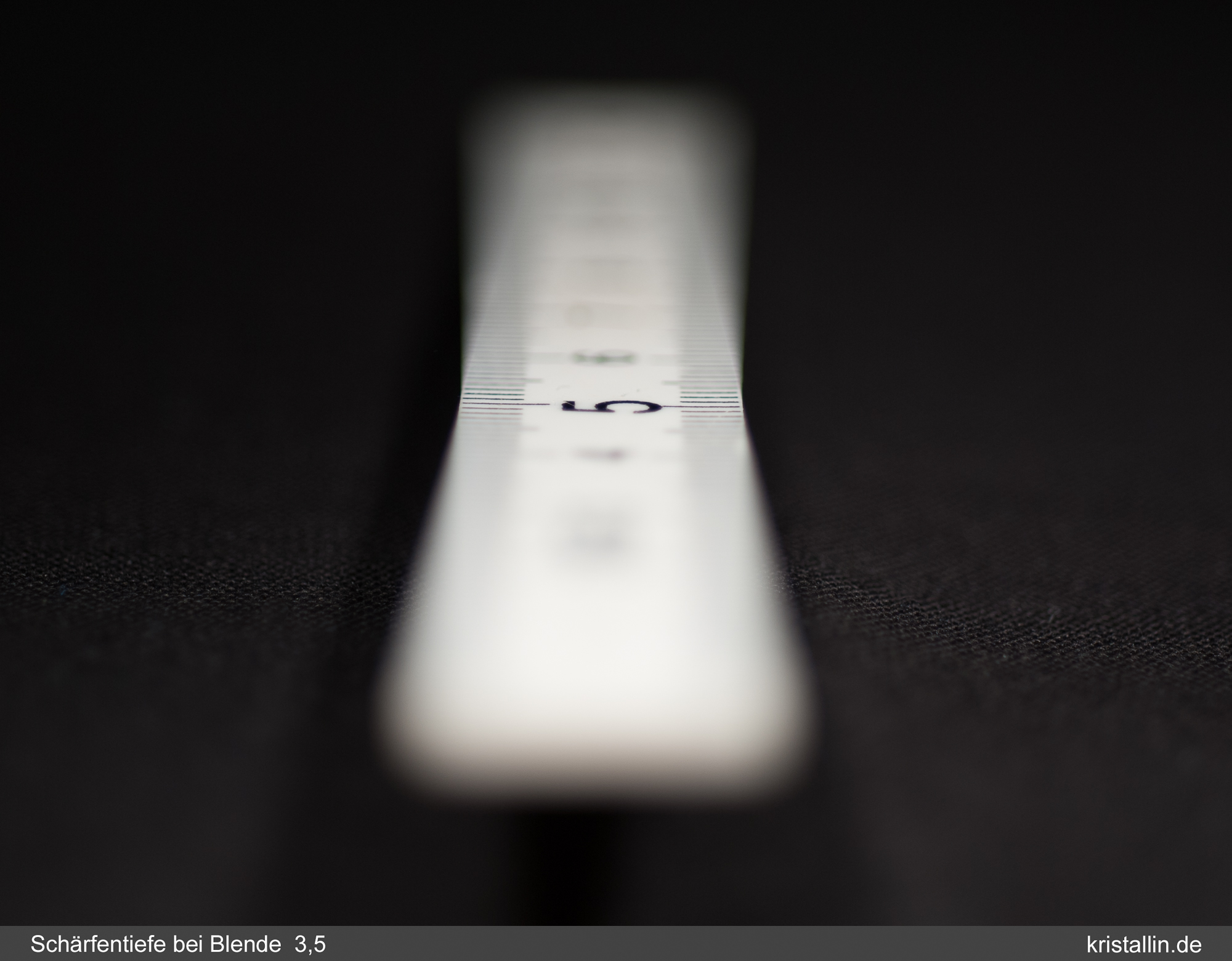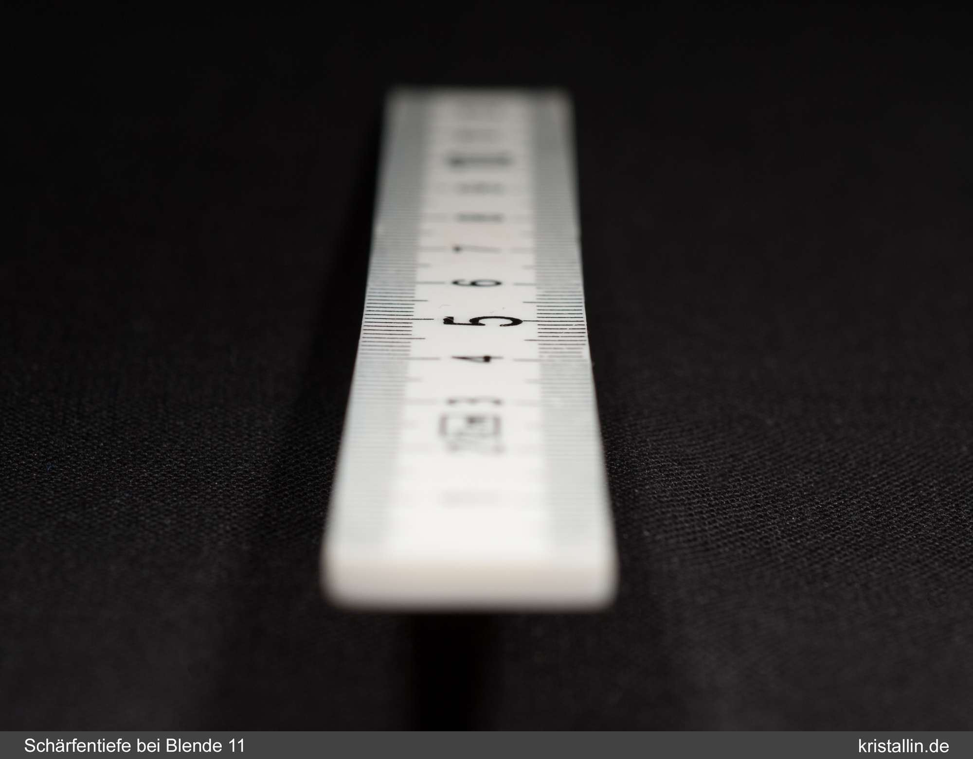 In allen drei Bildern wurde auf die 5 auf dem Lineal scharf gestellt. Anschließend wurde nur die Blende verändert. Der sich ergebende scharfe Bereich in Blickrichtung hängt allein von der Blende ab. Ist sie offen, so ist der scharfe Bereich kurz. Schließt man die Blende, vergrößert sich die Tiefenschärfe, was für Nahaufnahmen von elementarer Bedeutung ist.