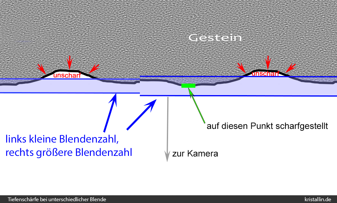 Das Verwackeln kann man auch durch kurze Belichtungszeiten vermeiden, sofern das Licht ausreicht. Das tut Ihre Kamera schon von allein, wenn Sie im Automatikmodus arbeiten. Weil aber Gesteine aus der Nähe recht dunkel sind, wird es schnell eng, sofern Sie nicht mehr Licht machen können. Außerdem verschenken Sie mit einer kurzen Belichtungszeit Schärfe, genauer gesagt: Tiefenschärfe. Die brauchen Sie aber dringend. Um den Zusammenhang zu verstehen, müssen wir einen Blick auf „Zeit“ und „Blende“ werfen.