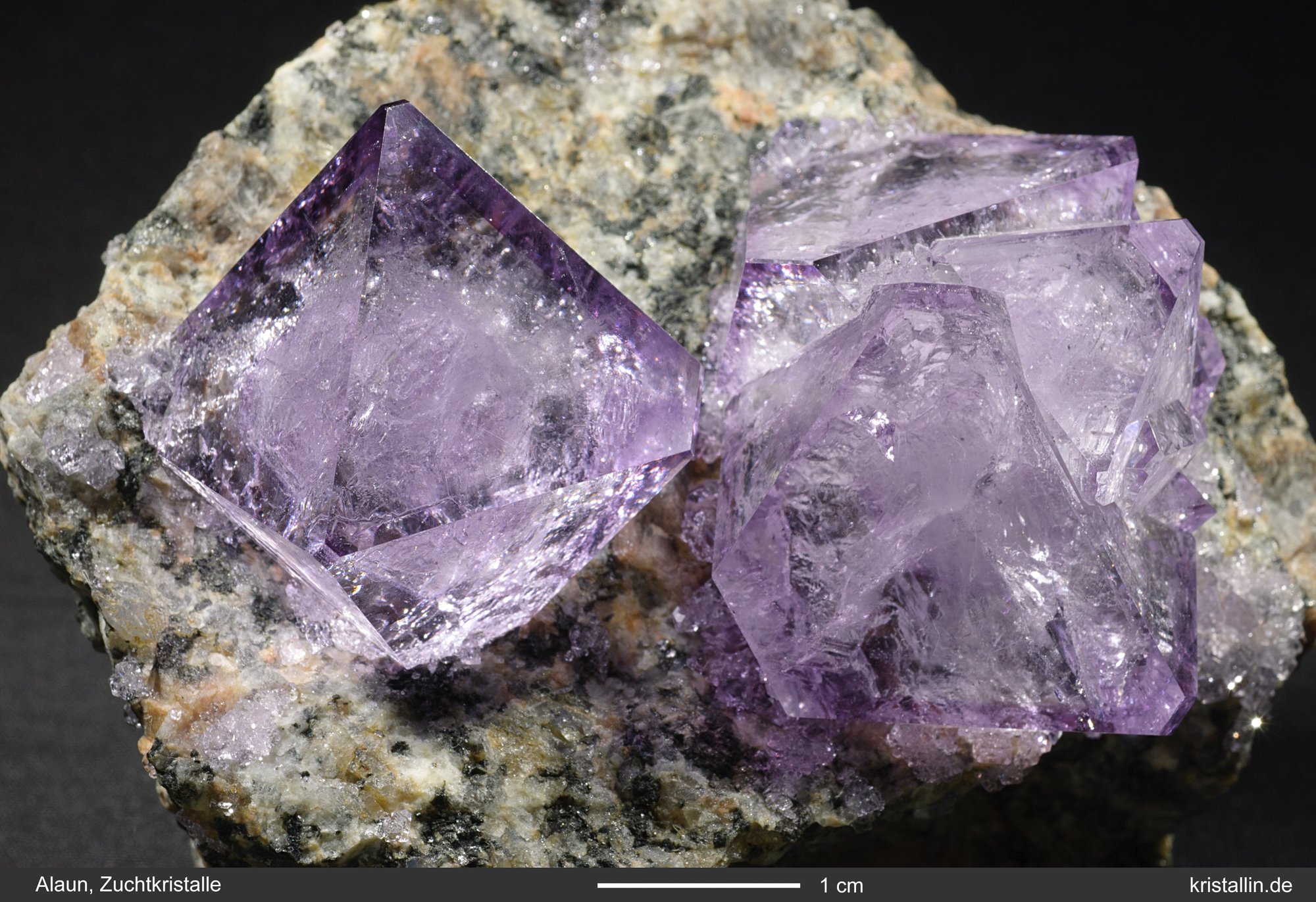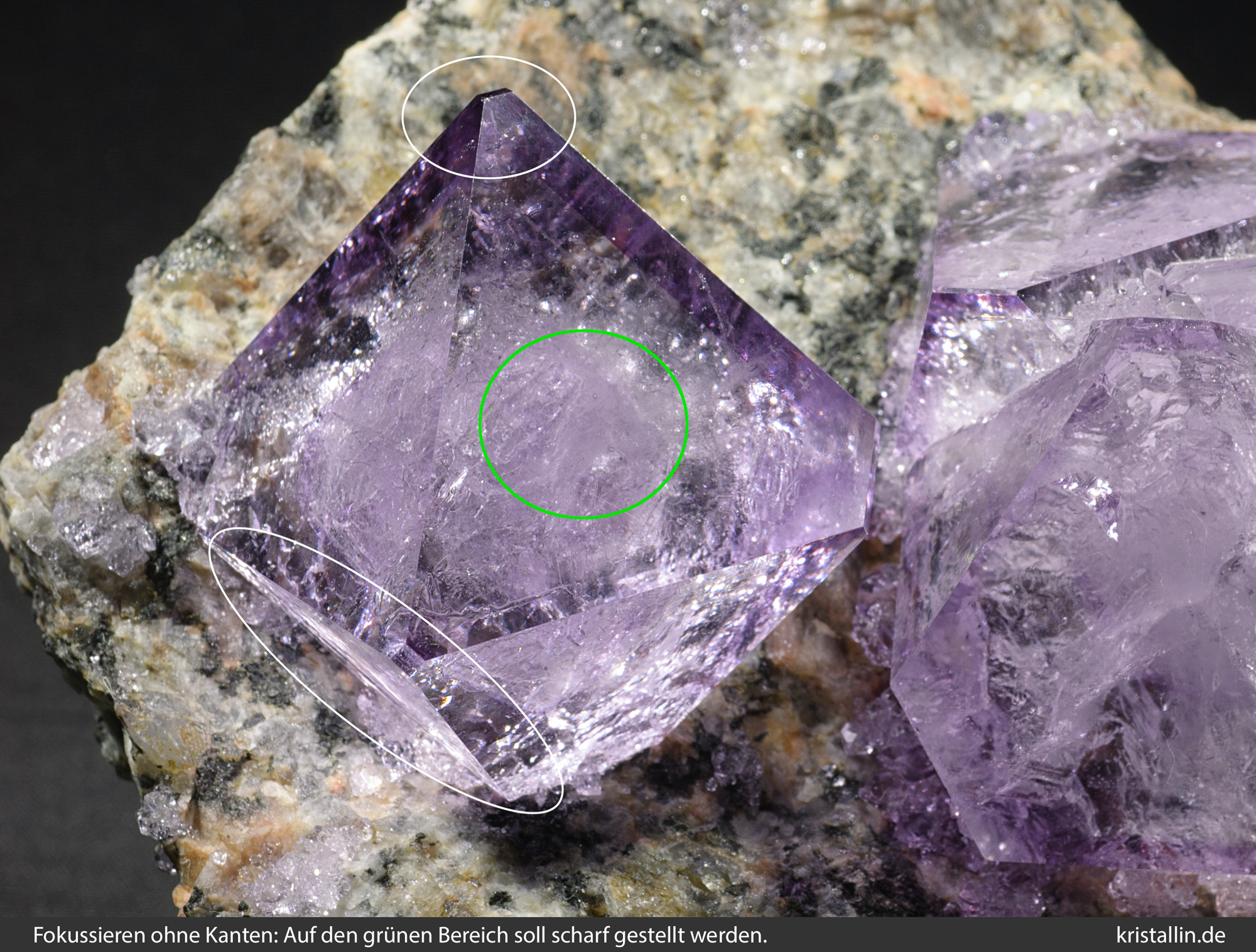 Dieses Bild zeigt farbige Alaunkristalle. Vor allem beim linken Kristall sollen die Kanten scharf sein – also dort, wo die weißen Ovale eingezeichnet sind. Dafür muss auf eine Entfernung scharf gestellt werden, die mitten in der konturlosen Fläche bei der grünen Ellipse liegt. Dort aber findet die Kamera keine Kante, auf die sie fokussieren könnte. In so einer Situation schalten wir den Autofokus ab und setzen den scharfen Bereich von Hand. Dabei hilft es, den Fokusring am Objektiv mehrmals zügig in jeder Richtung zu verstellen.