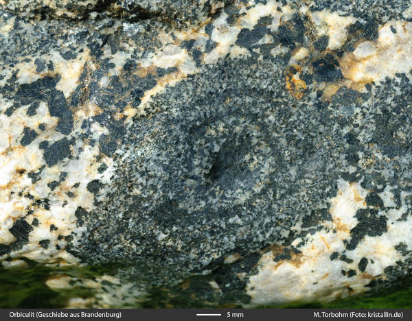 So sehen typische Orbicule aus. Von innen nach außen kristallisiert, bestehen sie aus einer konzentrischen Abfolge von Schalen aus dunklen Mineralen mit hellem Feldspat dazwischen. Im Kern der Orbicule steckt oft ein größerer Feldspat oder ein Gesteinsbruchstück, das als Kristallisationskeim dient.