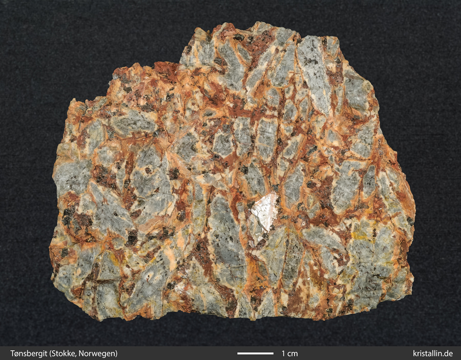 (17/57) So einen rotbraunen Larvikit bezeichnet man auch als Tönsbergit. Wenn die großen Feldspäte noch blaugrau aussehen, wirk das ganze Gestein bunt und ansprechend.