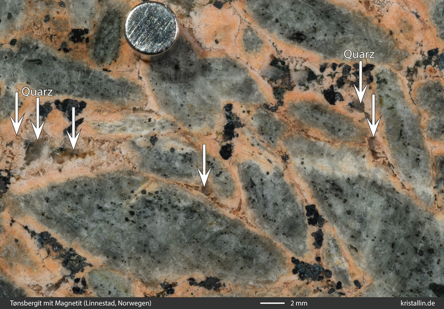 (19/57) Ausschnitt aus dem vorigen Tönsbergit. Der runde Magnet oben zeigt, dass es hier Magnetit gibt. Die Pfeile zeigen auf Quarz zwischen den Feldspäten. Die meisten Tönsbergite stammen aus einer frühen Phase der Larvikitbildung, in der das Gestein noch Quarz enthielt. (Bild ohne Beschriftung)