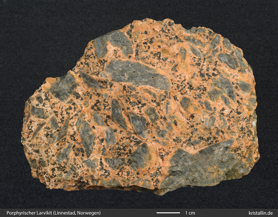 (21/57) Das ist ein porphyrischer Larvikit, da er weniger Feldspäte in sehr viel mehr Grundmasse enthält.