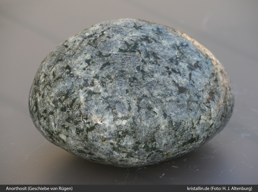 (45/57) Das ist ein Anorthosit mit nasser Oberfläche, den Hans-Jörg Altenburg auf Rügen fand. Dort gibt es praktisch keine Rhombenporphyre, also nahezu (oder gar keine?) norwegischen Gesteine. Das ist ein starker Hinweis darauf, dass das hier wohl kaum ein Larvikit sein wird.