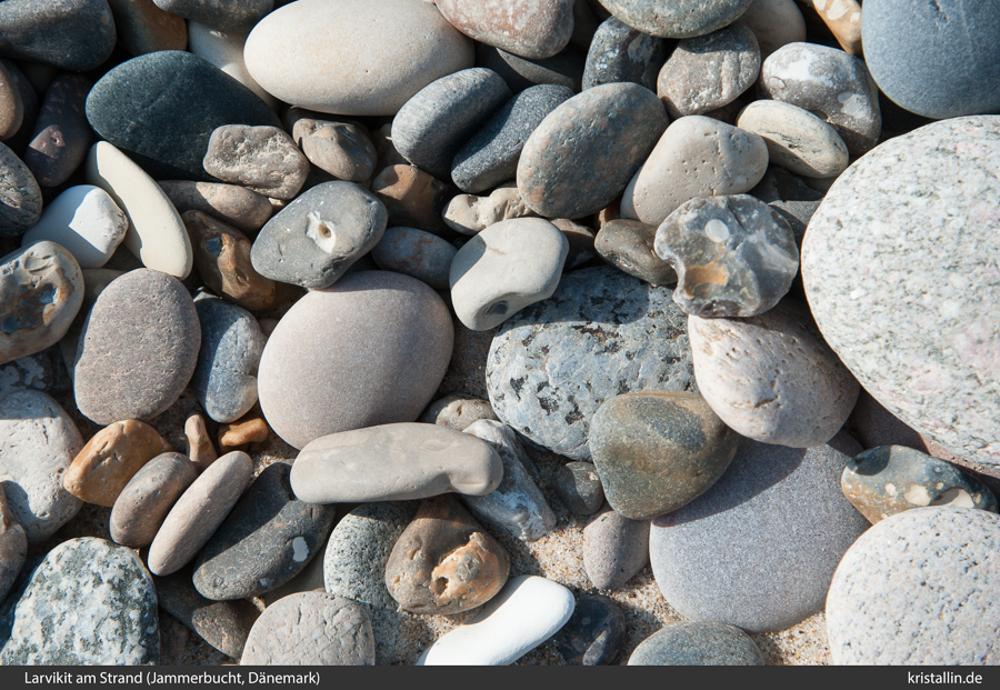 (57/57) Ein Larvikitgeschiebe im Norden Dänemarks. Wer norwegische Geschiebe sucht, hat es nördlich vom Limfjord ziemlich einfach. Allerdings muss man beim Bestimmen immer vorsichtig sein, denn auch die Geschiebe aus der Ostsee bis hin nach Åland liegen dort herum. Nicht alles, was magmatisch aussieht, kommt aus Norwegen.