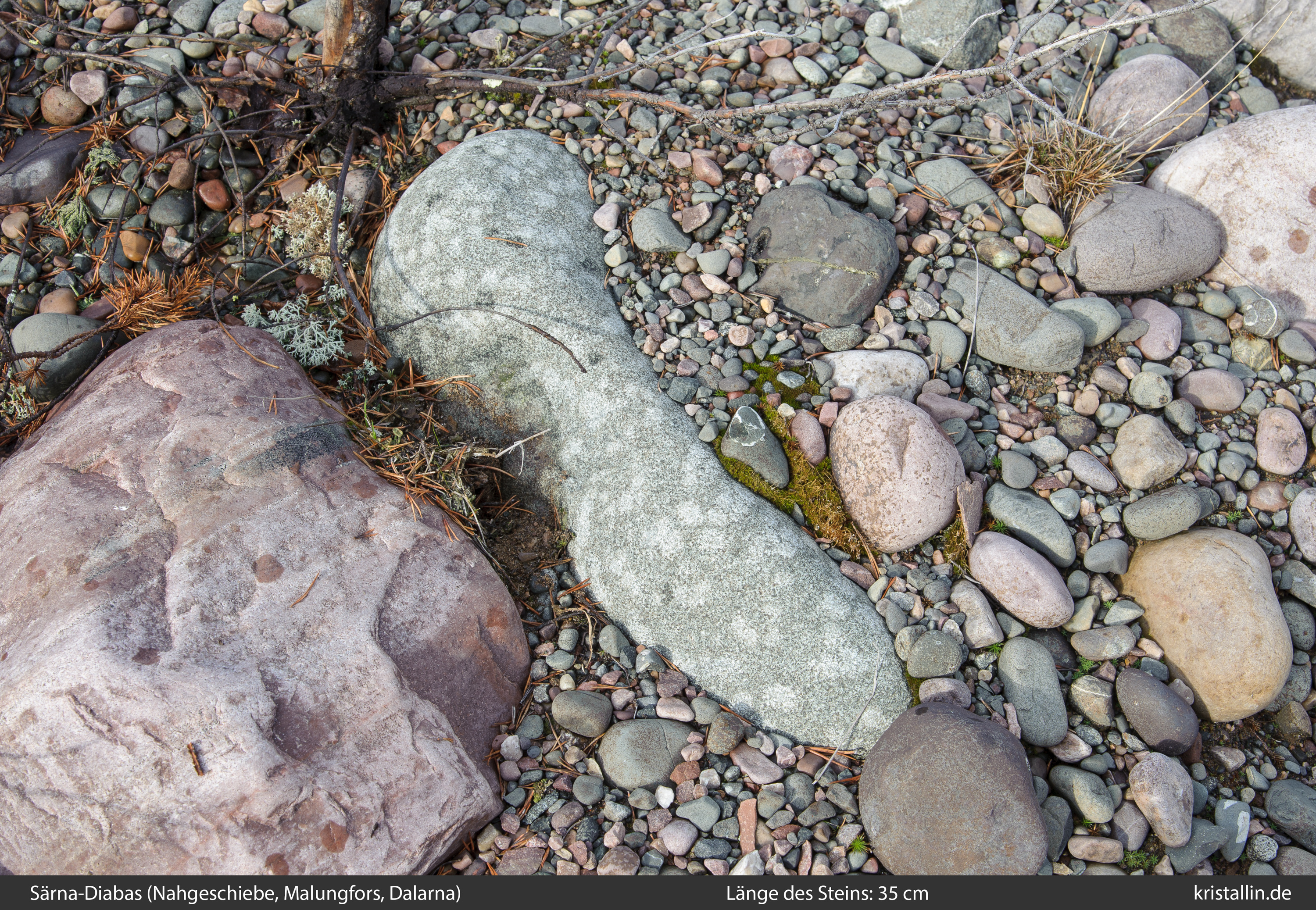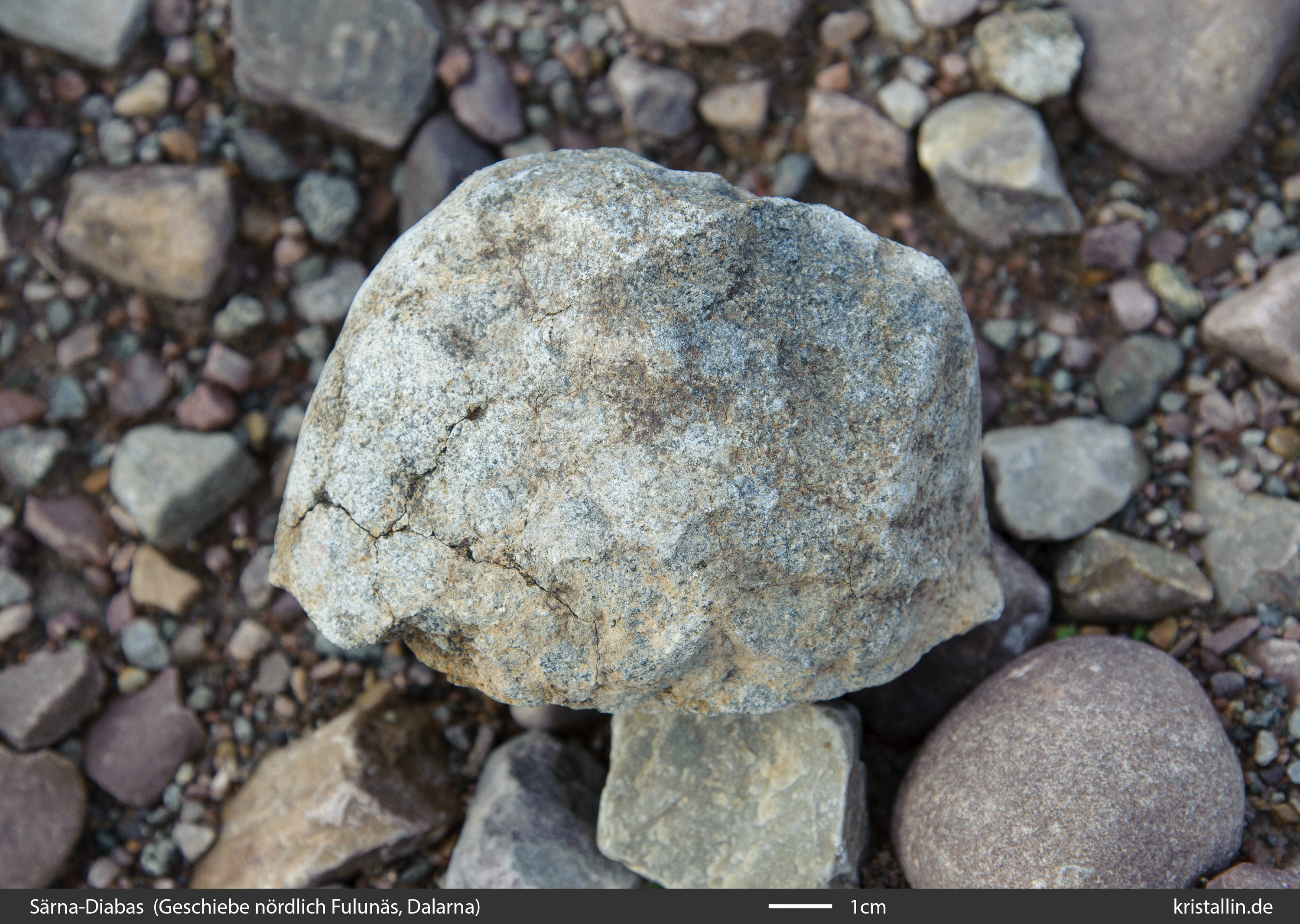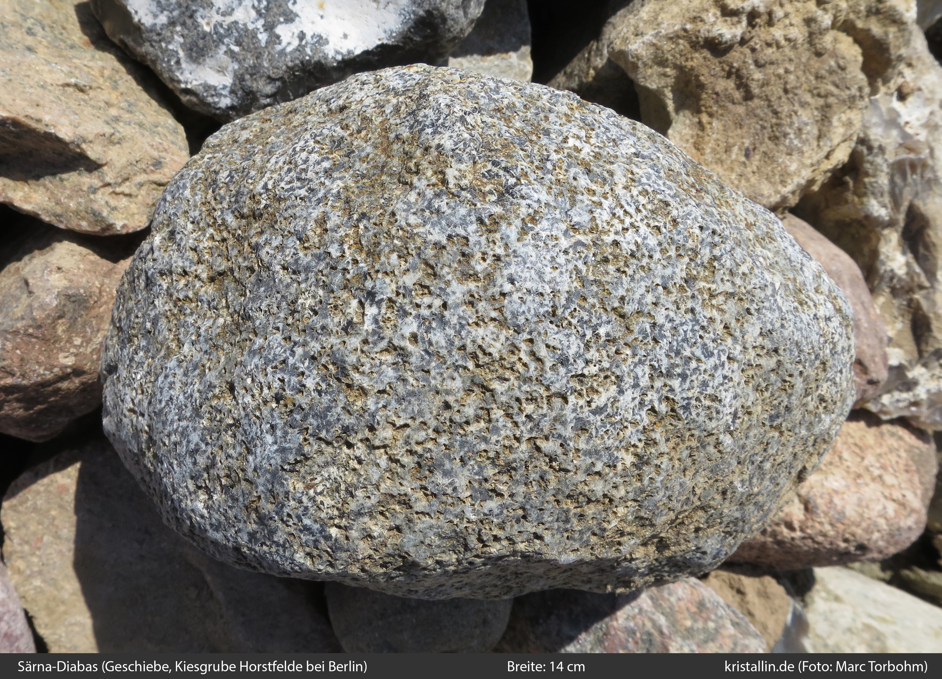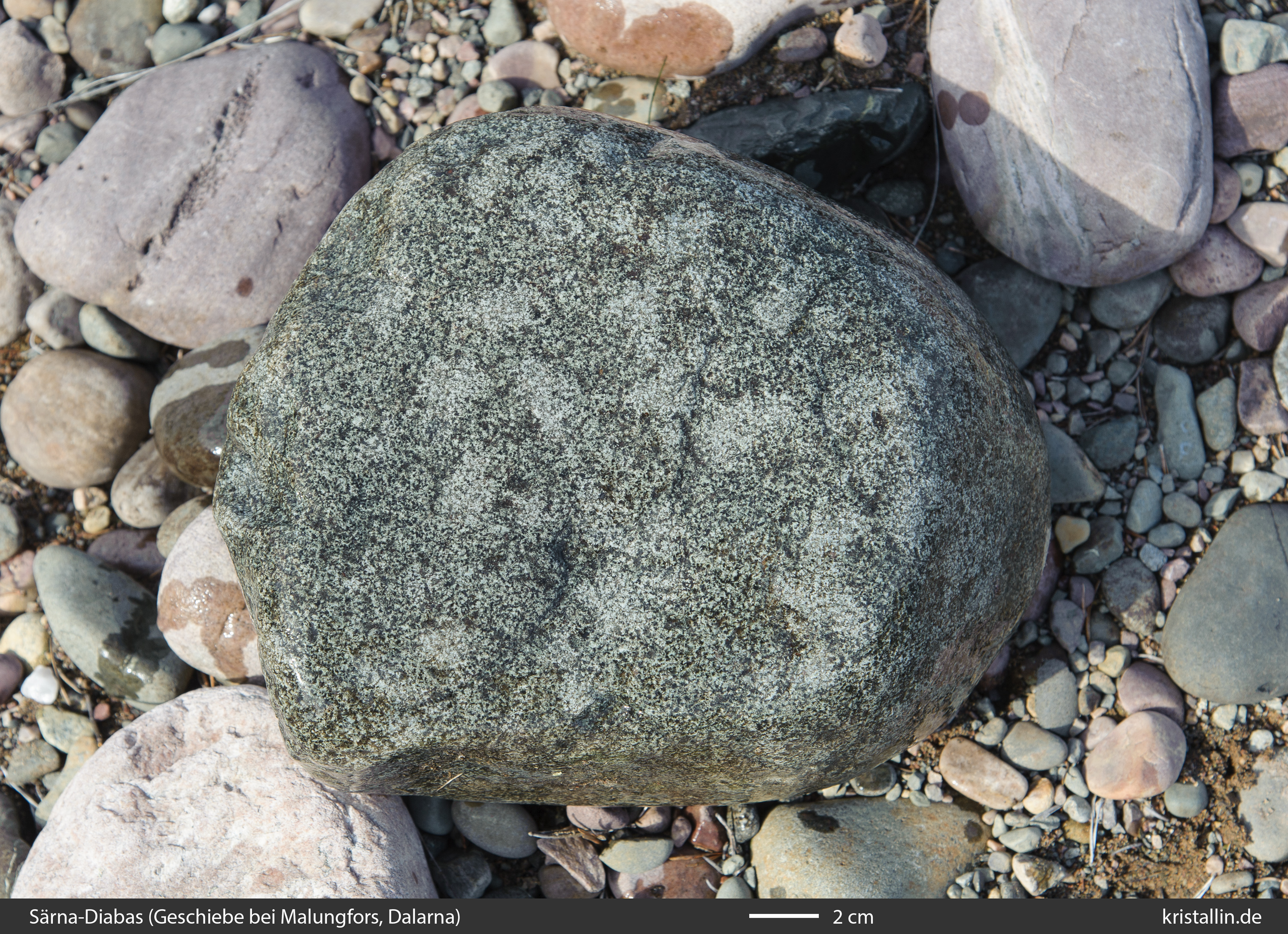Für die Bestimmung eines Fundes als Särna-Diabas genügt es, wenn die rundlichen Knoten von ca. 2-3 cm Durchmesser und viele kleine Feldspatleisten neben einem dunklen Mineral vorhanden sind. Die Knoten müssen untereinander mindestens 1 cm Abstand haben, so wie auf den Bildern der in Dalarna fotografierten Nahgeschiebe.
