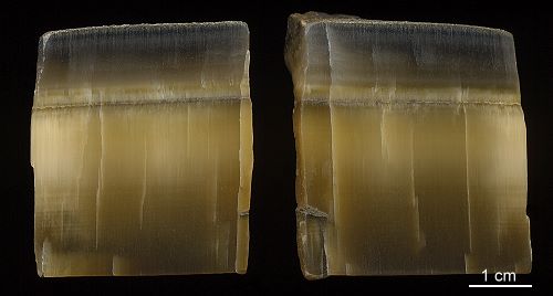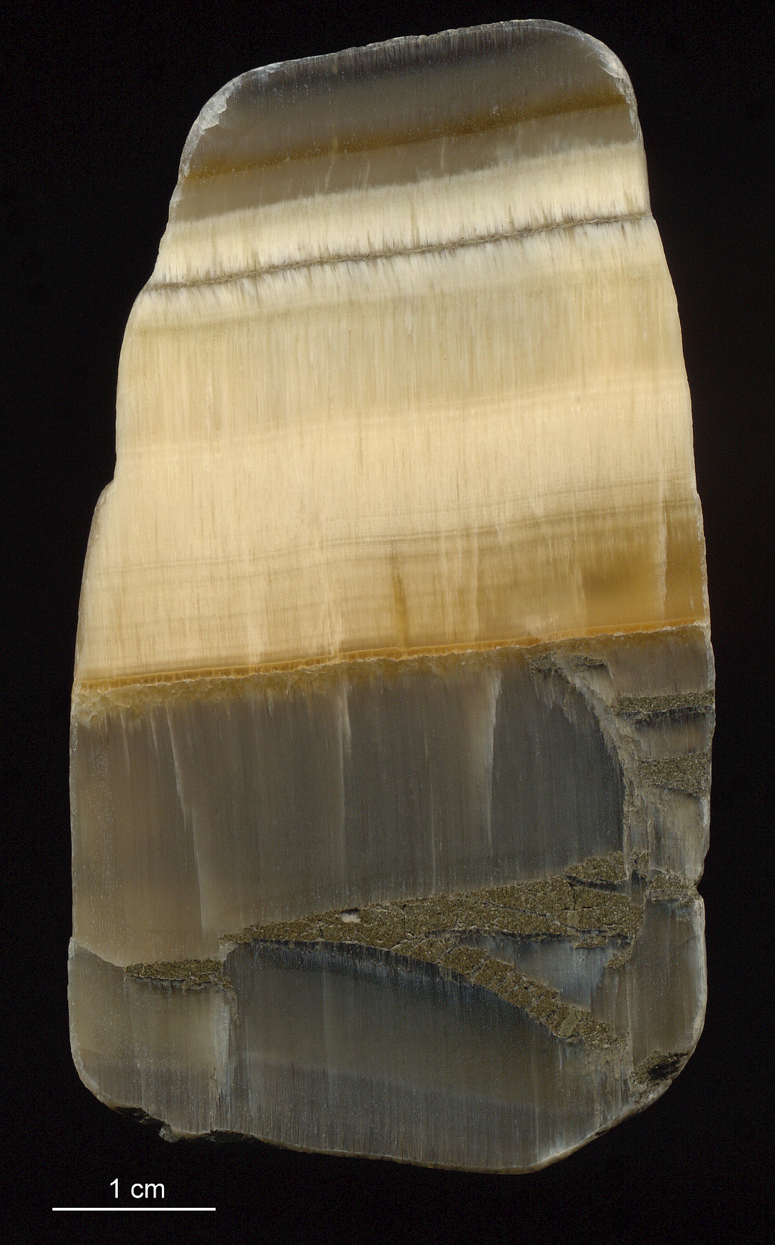 Diese Stücke sind als Füllungen in sedimentären Schichtlücken gewachsen. Stellt man sich eine horizontal verlaufende Schichtung in einem lockeren Sediment, z. B. in vulkanischen Aschelagen vor, so sind die Kalzitaggregate sehr wahrscheinlich von oben und von unten in diesen Schichtlücken gewachsen. Vom Aufeinandertreffen dieser beiden wachsenden Faserschichten rührt die Mittelnaht her, die nicht selten in den Faserkalken zu sehen ist. Oben sehen Sie ein abgerolltes Geschiebe vom Ostseestrand. Die Fasern verlaufen senkrecht, wie auch in allen anderen Proben hier. Die beiden Stücke auf dem unteren Bild sind geschnitten und poliert. Das linke stammt vom Weißenhäuser Strand, das rechte von Klützhöved (beides Ostsee). Das rechte Geschiebe zeigt am Rand deutliche Verwitterung. | ||||||||||||||||||||||||||||||||||||||||||||||||||||||||||||||||||||||||||||||||||||||||