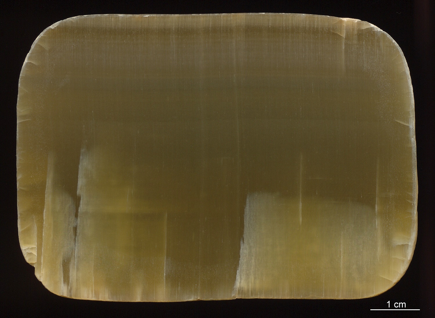 Faserkalk läßt sich wegen seiner geringen Härte leicht bearbeiten. Schmuckstücke oder Gebrauchsartikel, die aus diesem Material gefertigt werden, sind zwar nicht sehr kratzfest, zeigen dafür aber einen seidigen und schimmernden Glanz. Oft sind die Stücke zusätzlich noch durchscheinend, so daß sich ein ausgesprochen schönes Material für kleine Schmuckstücke ergibt. Von dieser Verwendung her rührt auch die Bezeichnung Ostseejade", wobei das Gestein mit echter Jade nichts zu tun hat. Nicht alle Faserkalke zeigen so gleichmäßige und schöne Gefüge. Einige enthalten braungraue Reste des Sediments, in dem der Faserkalk wuchs. Die faserigen Kalzitpartien sind dann nur unvollkommen miteinander verbunden. Solche Stücke brechen leicht auseinander. Siehe Bild unterhalb: Anpolierte Fläche. In den Fugen finden sich Reste von gering verfestigter vulkanischer Asche. Geschiebe von Klütz, Ostsee. | ||||||||||||||||||||||||||||||||||||||||||||||||||||||||||||||||||||||||||||||||||||||||