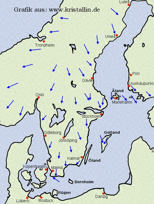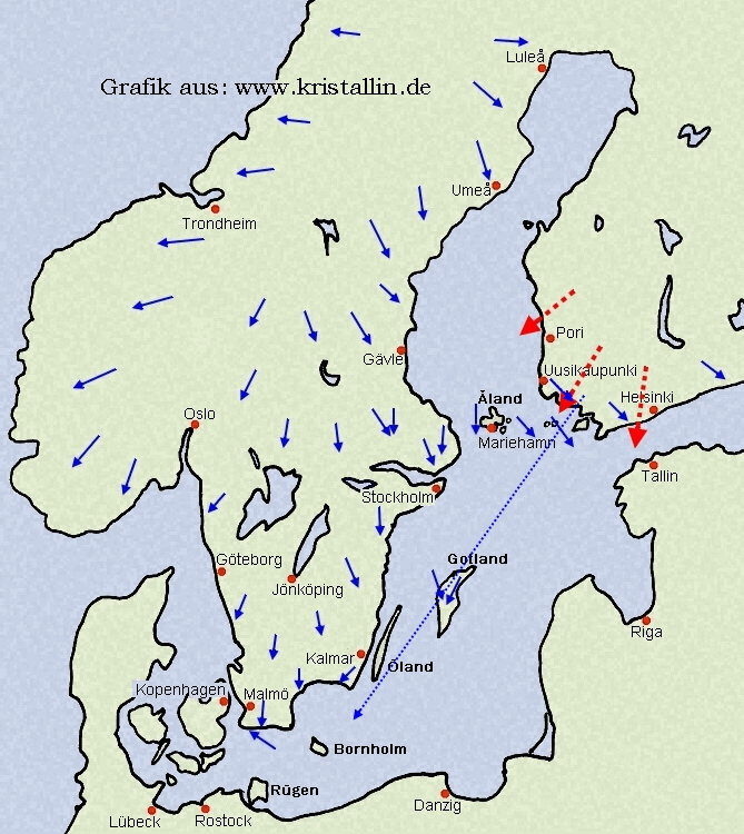 Zusätzlich liefern die Gletscherschrammen in den Herkunftsländern Norwegen, Schweden und Finnland ein gutes Bild darüber, wie sich dort das Eis bewegte. Im großen und ganzen paßt alles gut zusammen. Die Eisschrammen auf den Felsen zeigen mehr oder weniger nach Süden und die von dort stammenden Gesteine finden wir bei uns. Man geht im allgemeinen davon aus, daß der Eispanzer mit seiner Mitte über Schweden lag und von dort aus das Eis nach allen Richtungen abfloß. Daher liegen in England viele Gesteine aus Südnorwegen, in Mitteleuropa überwiegend schwedische Steine und in Estland und Westrußland die Vertreter aus Finnland.