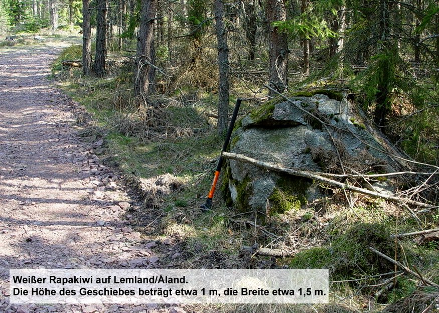 Einige Gesteine spielen nicht mit. Die Gletscherstriemen auf dem skandinavischen Gebirge sind überwiegend Momentaufnahmen aus den letzten Phasen der letzten Vereisung. Mit großer Wahrscheinlichkeit gab es aber noch andere Bewegungen als die, die sich aus den heute noch erhaltenen Spuren auf dem Untergrund ablesen lassen. Wir finden im Geschiebe nämlich auch Gesteine, die mit den Eisbewegungen, so wie sie sich aus den Gletscherschrammen ergeben, keinesfalls hierher gekommen sein können. Gesteine aus Finnland dürften eigentlich nicht hier sein - sie sind es aber doch. Wieso das? Die Gletscherschrammen (= Eisbewegung) zeigen im Osten der Ålandinseln und in ganz Finnland in die falsche Richtung. Die Gletscherspuren weisen dort einheitlich nach Südosten, weg von der Mitte des skandinavischen Gebirges, weg von Schweden. Wieso können wir dann aber hier in Norddeutschland und in den Niederlanden Gesteine finden, die aus Westfinnland oder sogar aus dem Wiborgpluton stammen und die eigentlich in Lettland oder Estland liegen müßten? Der Weg, den diese Steine genommen haben, liegt im rechten Winkel (!) zur Gletscherstriemung. Eine Möglichkeit wäre, kräftige Strömungen von Schmelzwässern in den Zeiten zwischen den Vergletscherungen anzunehmen. So könnten Flüsse in Zeiten der Gletscherschmelze einzelne Gerölle nach Westen in die Ostsee gespült haben, wo sie in der nächsten Eiszeit auf dem gewohnten Weg mitgenommen wurden. Dagegen spricht die Größe einiger Findlinge, die zweifellos den beschriebenen Weg zurückgelegt haben. Ein Beispiel ist ein weißer Festlandsrapakiwi, der auf der Insel Lemland (ein Teil von Åland) liegt und schon deutlich über 1,5 Tonnen wiegt. (Bild, 300 kB) Das Gestein stammt sehr wahrscheinlich aus dem Nystadt-Massiv an der finnischen Küste. Um dorthin zugelangen, wo er heute liegt, mußte er sich nach Südwesten bewegen. Im Herkunftsgebiet (Südwestfinnland) bewegte sich das Eis aber nach Südosten. Ein zweites Beispiel ist ein Großgeschiebe auf dem Autobahnrastplatz "Rosengarten" im Süden von Hamburg. Es handelt sich um ein Musterbeispiel eines Rapakiwis vom finnischen Festland, das etwa 12 Tonnen wiegt und dessen Status als Geschiebe verbürgt ist. (Bild, 300 kB) Auch dieses Gestein hat sich insgesamt anders bewegt, als die Gletscher der letzten Eiszeit. Lothar Eissmann 1) bietet eine Lösung an, die viel für sich hat: Die Transporte der finnischen Gesteine zu uns werden verständlich, wenn man annimmt, daß sich das zentrale Gebiet der Vergletscherung sich während der Eiszeiten weit nach Osten verlagert hat .