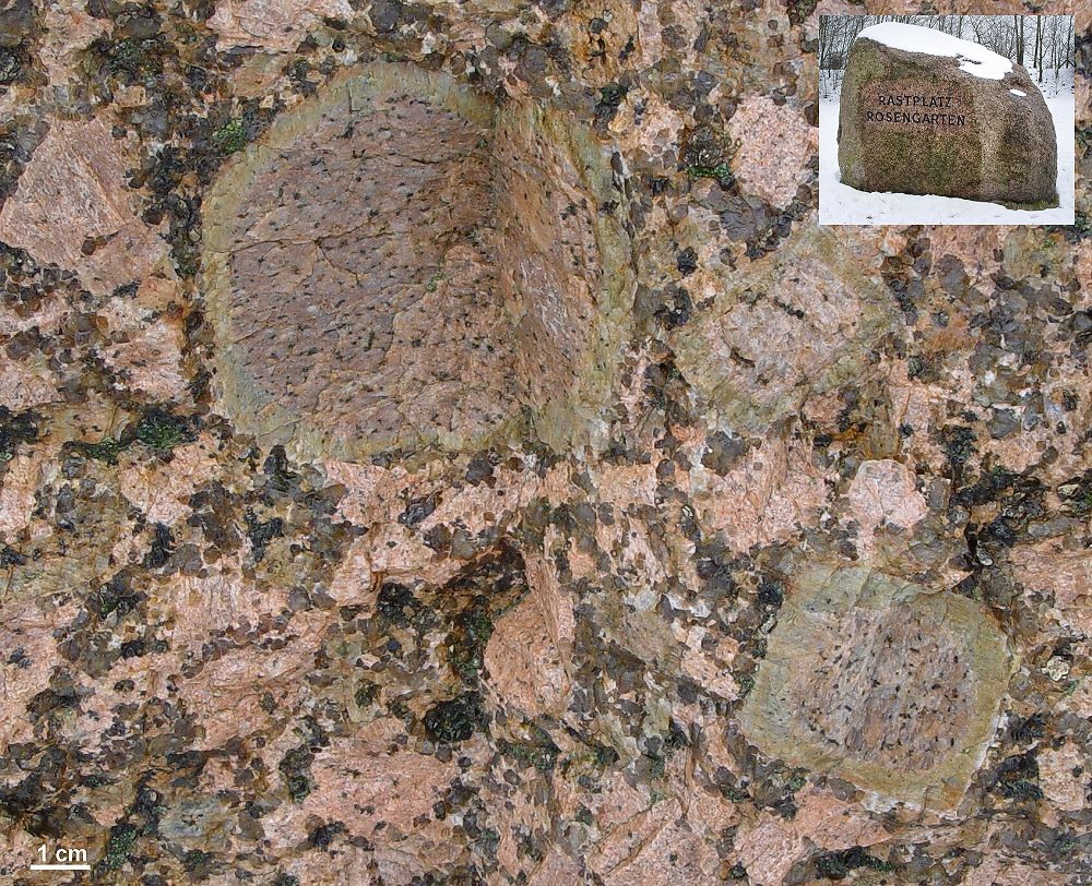 Was sind Leitgeschiebe? Da die Gletscher bei ihrer Bewegung massenhaft Gesteine mitgenommen haben, kann man, wenn man die Herkunft dieser Steine ermittelt, Rückschlüsse auf die Bewegungen des Eises ziehen. Dazu braucht man typische, leicht wiedererkennbare Gesteinstypen, die aus einer eingrenzbaren Region im Norden stammen. Finden sich diese Gesteine hier im Geschiebe, beweist das den Transport aus dieser Landschaft zu uns. Solche Gesteinstypen, die unverwechselbare Merkmale haben und in Skandinavien nur in einer Gegend vorkommen, nennt man „Leitgeschiebe". Ein Beispiel für ein solches Leitgeschiebe ist der folgende Rapakiwi-Granit.