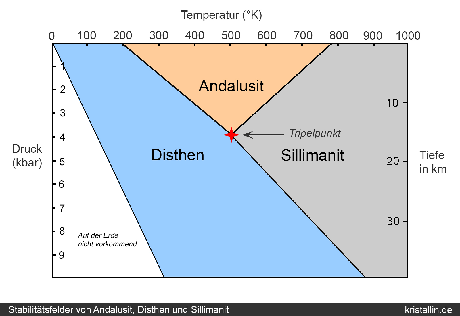 Das Diagramm zeigt die Stabilitätsfelder der drei Minerale. Der Tripelpunkt,