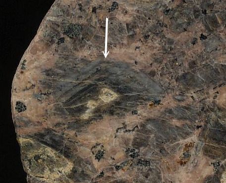 Der hier abgebildete Nordmarkit enthält viel Biotit. Die Plättchen des Glimmers sind in Paketen geschichtet, die im Bild quer geschnitten sind. Die Pfeile weisen darauf. | ||||||||||||||||||||||||||||||||||||||||||||||||||||||||||||||||||||||||||||||||