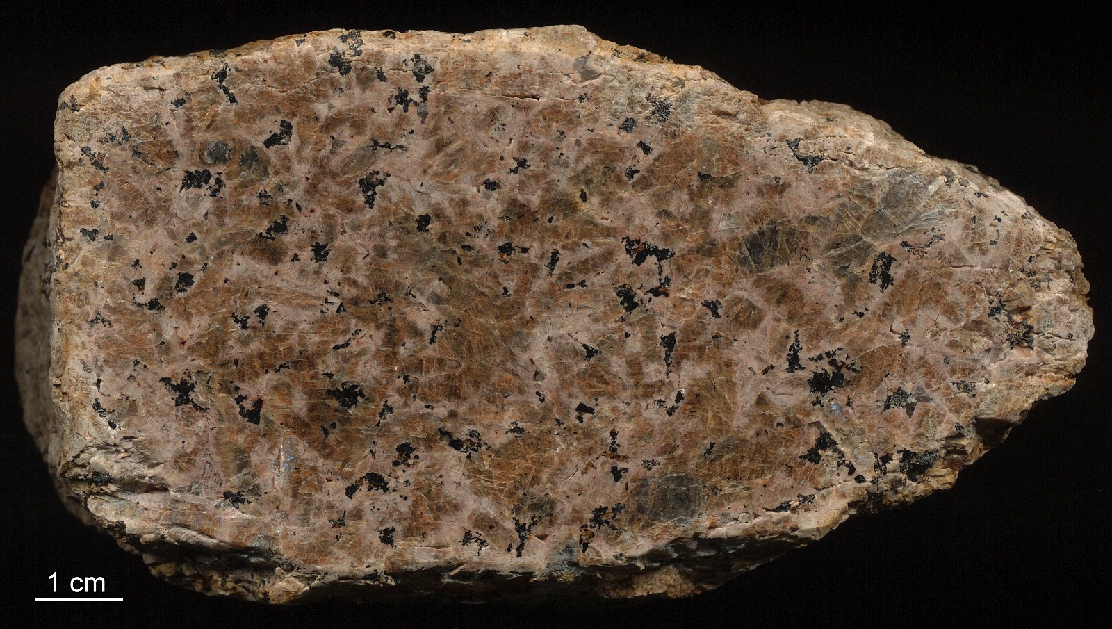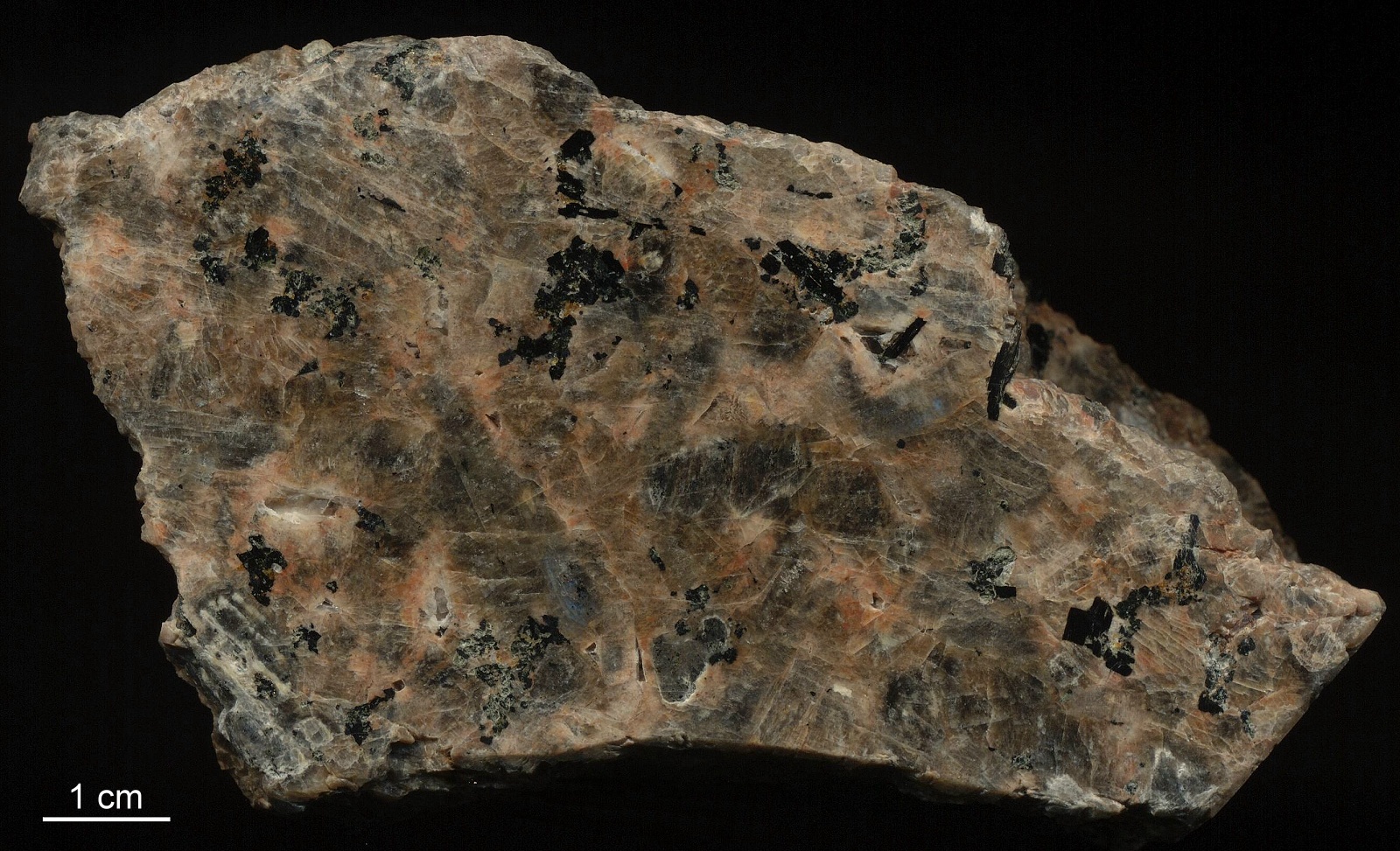 Auch das nächste Geschiebe stammt von Fehmarn. Es enthält auffällig viel Titanit: Braune, teilweise idiomorphe Kristalle auf den Korngrenzen der Alkalifeldspäte. | ||||||||||||||||||||||||||||||||||||||||||||||||||||||||||||||||||||||||||||||||