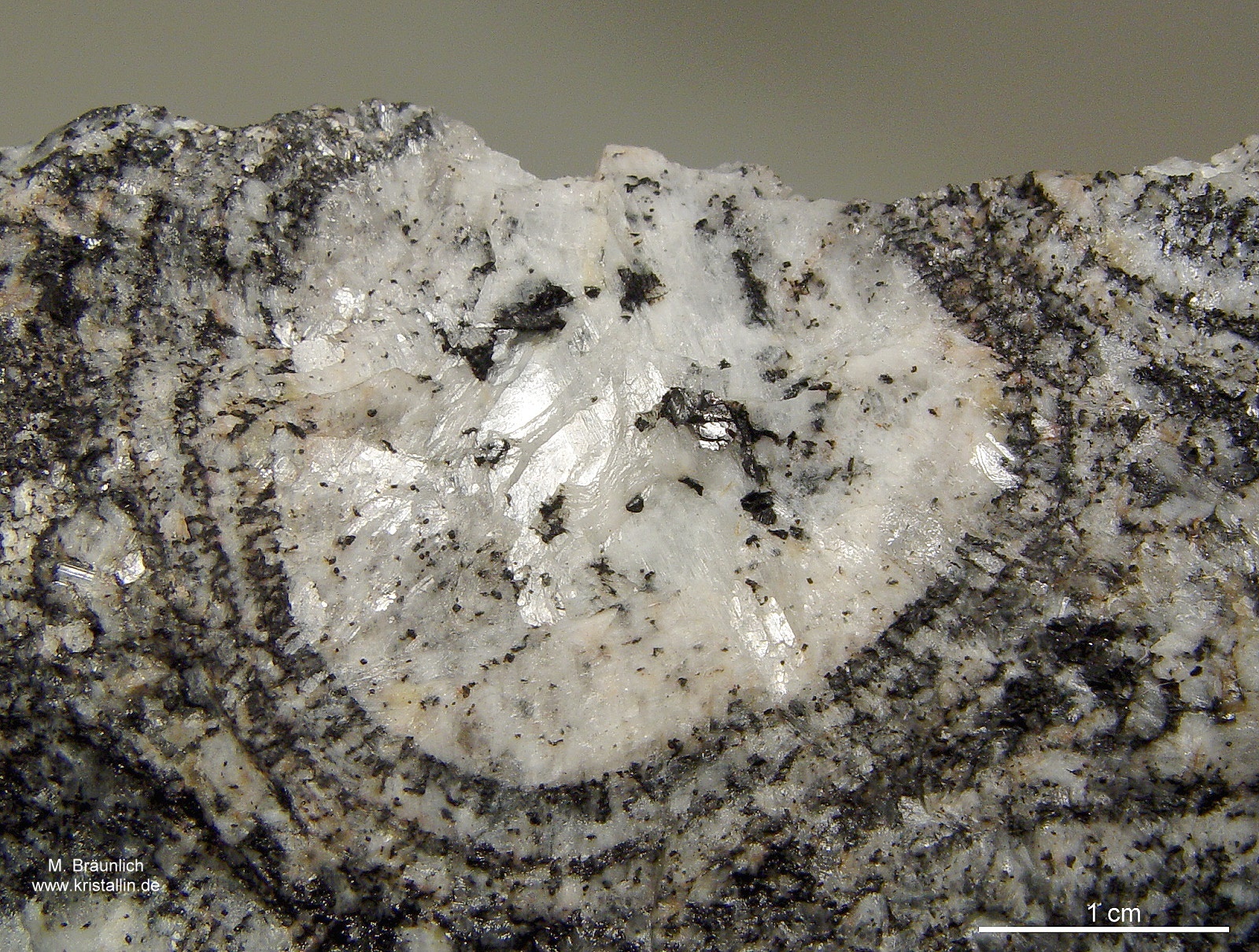 Das weiße Mineral ist Plagioklas, die dunklen Bestandteile sind