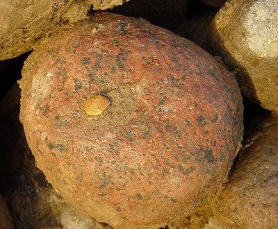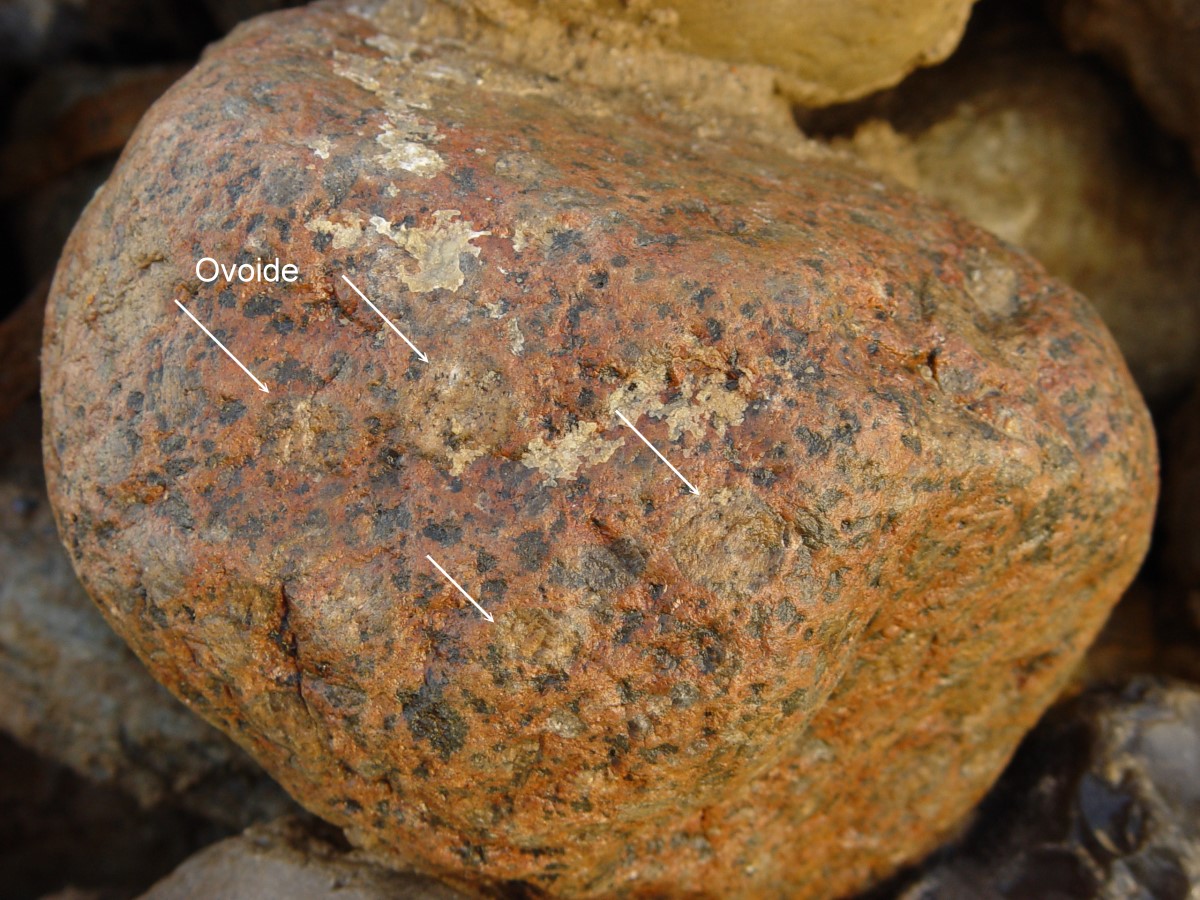Unten: Nasses Geschiebe, Kiesgrube Schwissel, Schleswig-Holstein. Die Ovoide sind als Ganze angewittert und hell. Das Gestein zu erkennen ist keine Kunst. | ||||||||||||||||||||||||||||||||||||||||||||||||||||||||||||||||||||||||||||||||||||||||||||||||||||||||||||||||||||||||||||||||