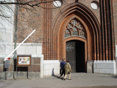 Stralsund: Am Eingang der Marienkirche. Im unteren Bereich der Außenmauern sind diverse große Rapakiwiblöcke verbaut worden. Der Pfeil weist auf den, dessen Nahaufnahme hier unterhalb steht. Es gibt verschiedene Exemplare dort. | ||||||||||||||||||||||||||||||||||||||||||||||||||||||||||||||||||||||||||||||||||||||||||||||||||||||||||||||||||||||||||||||||