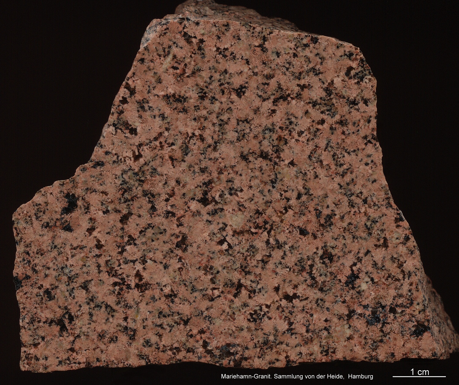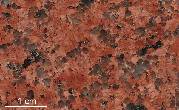 Ausnahmsweise sind hier zwei Beschreibungen zusammengefaßt. Haga-Granit und Mariehamn-Granit stammen von der Hauptinsel Ålands. In der Geschiebekunde werden beide gelegentlich zusammen genannt oder in eins gesetzt. Ob das berechtigt ist, mag jeder selbst entscheiden. Beide Gesteine gehören zur Gruppe der gleichkörnigen Rapakiwigranite. Sie zeigen ein einheitliches, gleichmäßiges Gefüge, das hauptsächlich von Alkalifeldspat und Quarz gebildet wird. Es gibt keine oder nur ausnahmsweise mal einzelne Einsprenglinge. Haga-Granit: Das Gestein kommt aus dem Norden der Hauptinsel und ist nach der Siedlung Haga benannt. Es ist von meist kräftig roter Farbe, wobei es wie üblich der Alkalifeldspat ist, der diese Farbe trägt. Die Quarze sind hell-milchig bis schwach rauchgrau und haben eine deutliche Tendenz zur Ausbildung ihrer Eigengestalt. Erkennbar ist das an den kantigen Umrissen. Plagioklas tritt nur sehr untergeordnet auf und ist heller. Das Gestein enthält nur wenig dunkle Minerale, in diesem Fall Biotit. Die erste Probe stammt von einem Straßenaufschluß nördlich von Ödkarby, sie trägt auf der Karte die Nummer 36. | ||||||||||||||||||||||||||||||||||||||||||||||||||||||||||||||||||||||||||||||||||||||||||||||||||||||||||||||||||||
