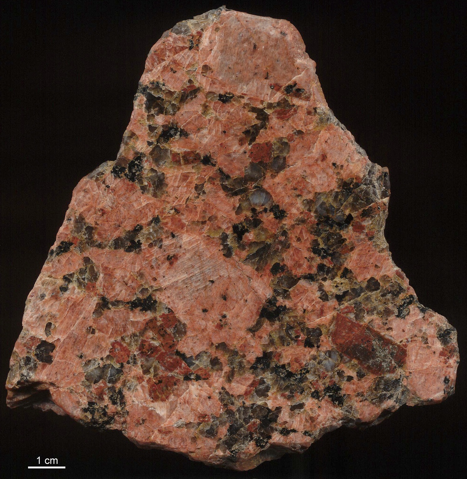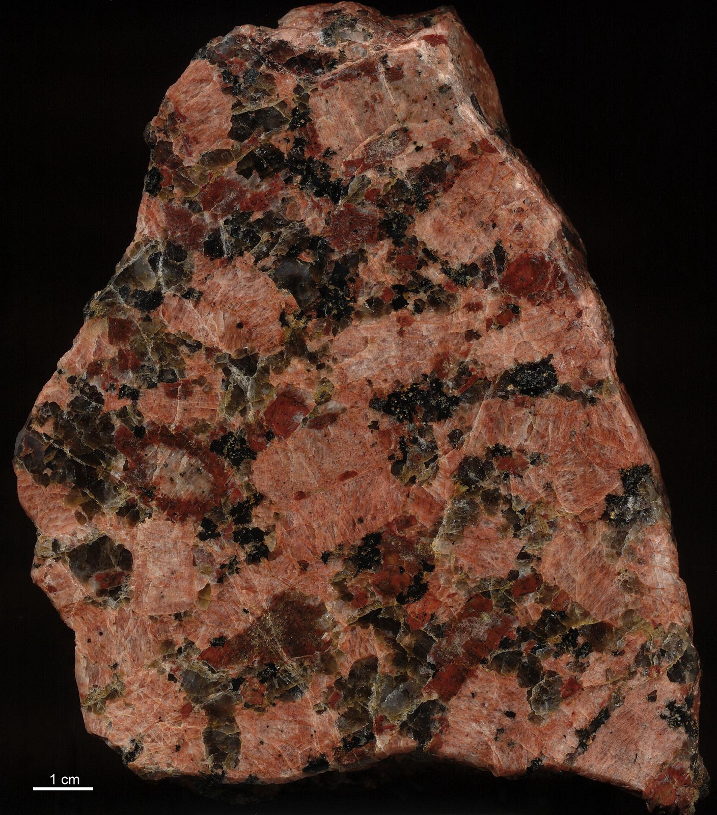 Wegen der abgelegenen Lage sind Gesteinsproben ziemlich rar. Zwei Handstücke gibt es im Naturkundemuseum in Leipzig. Sie wurden 1924 von Fritz Mende (Oschatz/Sachsen) mitgebracht. Die Bilder finden Sie auf dieser Seite. Der Kökar-Rapakiwi ist stark porphyrisch. Die großen, hell-fleischfarbenen Alkalifeldspäte dominieren das Gefüge. Sie sind teilweise idiomorph und oft als Karlsbader Zwillinge ausgebildet. Sie zeigen eine so deutliche perthitische Entmischungen, daß man sie im Stehen auf dem Boden erkennen kann. Der Alkalifeldspat ist ein Mikroklin. Nur ab und zu gibt es Ovoide im Gestein, die dann jedoch bis etwa 8 cm Durchmesser erreichen können. Es finden sich keine Plagioklassäume um die Alkalifeldspäte, das Gestein ist also ein Pyterlit. Der Plagioklas im Gestein ist wegen seiner rotbraunen Farbe auffällig. Nicht selten finden sich idiomorphe Kristalle, die bis zu mehreren Zentimetern Größe erreichen. Das Mineral kommt aber auch als Zwickelfüllung vor. Vereinzelt finden sich in den großen Alkalifeldspäten kleine Kerne von rotbraunem Plagioklas. Polierter Schnitt. | ||||||||||||||||||||||||||||||||||||||||||||||||||||||||||||||||||||||||||||||||||||||||||||||||||||||||||||||||||||