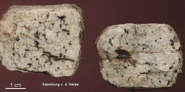 Dieser Rapakiwi neigt lokal zu einer verstärkten Verwitterung. Zwei der dabei freigelegten Feldspäte sind hier abgebildet. Beachten Sie, daß diese selbst kaum angegriffen sind. Die Zersetzung ist eine weitgehend mechanische Lockerung. Der dabei entstehende Grus besteht aus teilweise recht frischen Feldspäten. | ||||||||||||||||||||||||||||||||||||||||||||||||||||||||||||||||||||||||||||||||||||||||||||||||||||||||||||||||||||