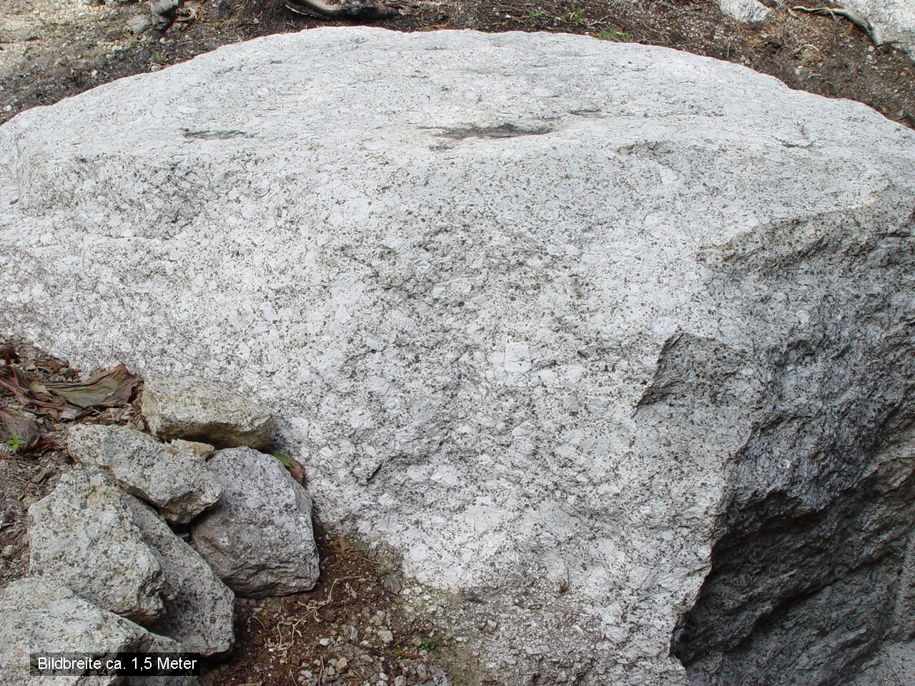 An diesem Fels fand sich ein besonders schöner runder Kalifeldspat. Der Ovoid hat einen Durchmesser von 8 cm. | ||||||||||||||||||||||||||||||||||||||||||||||||||||||||||||||||||||||||||||||||||||||||||||||||||||||||||||||||||||