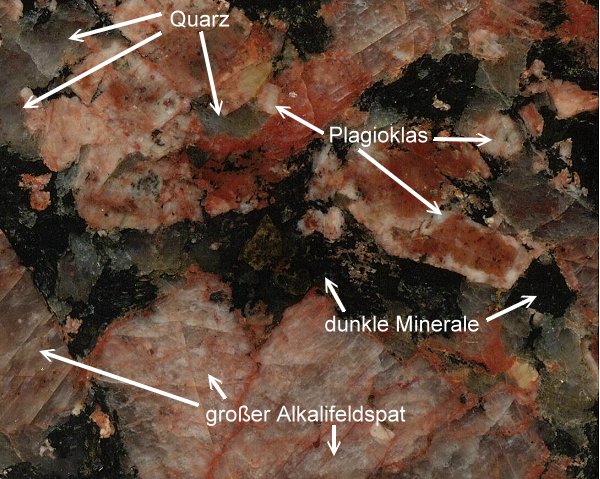 Ein eindrucksvolles, sehr grobkörniges Gestein, das aus Mengen großer Alkalifeldspäte inmitten einer schwarzen Masse besteht. Erst bei näherem Zusehen erkennt man den Quarz im Gestein, der milchig und hellgrau ist. Vereinzelt kommen auch schöne blaue Quarze vor. Die hier abgebildete Form des porphyrischen Graverfors-Granits wird durch die großen Alkalifeldspäte geprägt. Sie erreichen Größen von mehr als 6 cm, die meisten sind um 2- 4 cm groß. Oft sind sie als Karlsbader Zwillinge ausgebildet. Sie stecken in einer Masse aus schwarzem Biotit und anderen, makroskopisch nicht näher bestimmbaren dunklen Mineralen. Viele der großen Alkalifeldspäte sind von feinen roten Äderchen durchzogen. Der Plagioklas ist heller, oft blaßgelblich und teilweise nur spärlich enthalten. Das Mineral ist in Form kleiner Körner oder idiomorpher Kristalle ausgebildet. Einige Plagioklase gruppieren sich um die Außenseite der großen Kalifeldspäte, teilweise bilden sie Säume. Vollständige Säume kommen gelegentlich bei den kleineren Alkalifeldspäten vor. Das Gefüge des Granits ist meist undeformiert, gelegentlich aber auch etwas eingeregelt. Die Proben stammen aus der Gegend nördlich von Åby (östlich von Graverfors) bzw. direkt aus Graverfors. Das Granitmassiv ist mit knapp 10 km Durchmesser ziemlich klein. Es befindet sich nördlich von Norrköping und steckt als jüngerer Granit inmitten der svekofennischen Metamorphite. Auf der geologischen Karte ist an der rundlichen Form des Vorkommens schon zu erkennen, daß es sich um einen später eingedrungenen Granit handelt. Die Feldspäte sind in diesem Granit teilweise schwach deformiert. Die Spaltflächen haben keine ebenen, sondern leicht gewölbte und verbogene Oberflächen. Das Alter des Graverfors-Granits liegt bei knapp 1830 Millionen Jahren. | |||||||||||||||||||||||||||||||||||||||||||||||||||||||||||||||||||||||||||||||