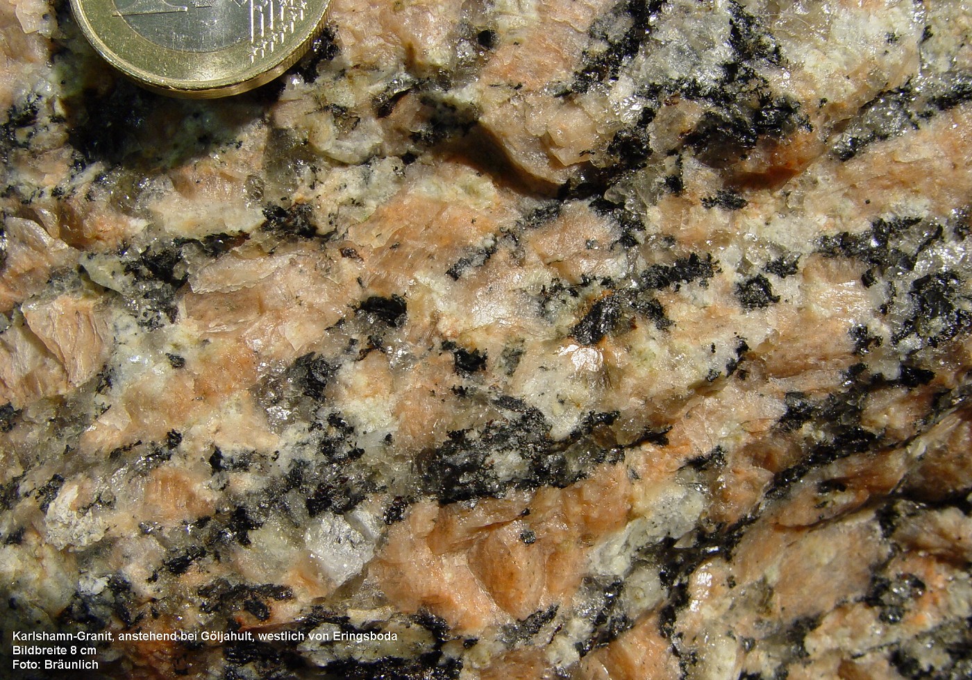 Das Gestein stammt aus Blekinge, im Südosten Schwedens gelegen. Dieser Granit gehört zu den grobkörnigen und ist im Geschiebe recht leicht zu erkennen. Die Alkalifeldspäte sind rötlich bis fleischfarben und ein großer Teil von ihnen ist als Karlsbader Zwilling ausgebildet. Oft zeigt das Gefüge eine leichte Einregelung, d.h. daß die länglichen Feldspäte in etwa parallel oder zumindest in einer Richtung liegen. Im Bruch zeigen sich gelegentlich Deformationen: Die Spaltflächen der Alkalifeldspäte sind nicht ganz eben, sondern leicht verbogen. Auffällig ist der zuweilen hohe Anteil an Biotit, der sich in Streifen zwischen den Feldspäten findet. Biotit und Feldspäte bilden zusammen ein kontrastreiches Gefüge. Der Plagioklas ist heller als der Alkalifeldspat - eine Farbverteilung, die sich oft in Graniten findet. Auf den Fotos ist der Plagioklas das helle bis gelbliche Mineral, das zwischen den großen Alkalifeldspäten und dem Biotit zu finden ist. Der Quarz, gut erkennbar an seinem Glas- bis Fettglanz, tritt in bräunlichen, grauen und leicht bläulichen Farben auf. Karlshamn-Granit ist (ebenso wie die Granite von Bornholm) "etwas" jünger als das svekofennische Umgebungsgestein. Er wurde vor etwa 1,45 Ga. während der dano-polonischen Orogenese gebildet. Sie ist ein Zwischenglied zwischen der svekofennischen und der svekonorwegischen Gebirgsbildung. Die dazu gehörenden Gesteine finden sich nur in Blekinge und auf Bornholm. Die erste Probe stammt aus der Gegend von Göljahult, westlich von Eringsboda im Nordteil von Blekinge. | |||||||||||||||||||||||||||||||||||||||||||||||||||||||||||||||||||||||||||||||