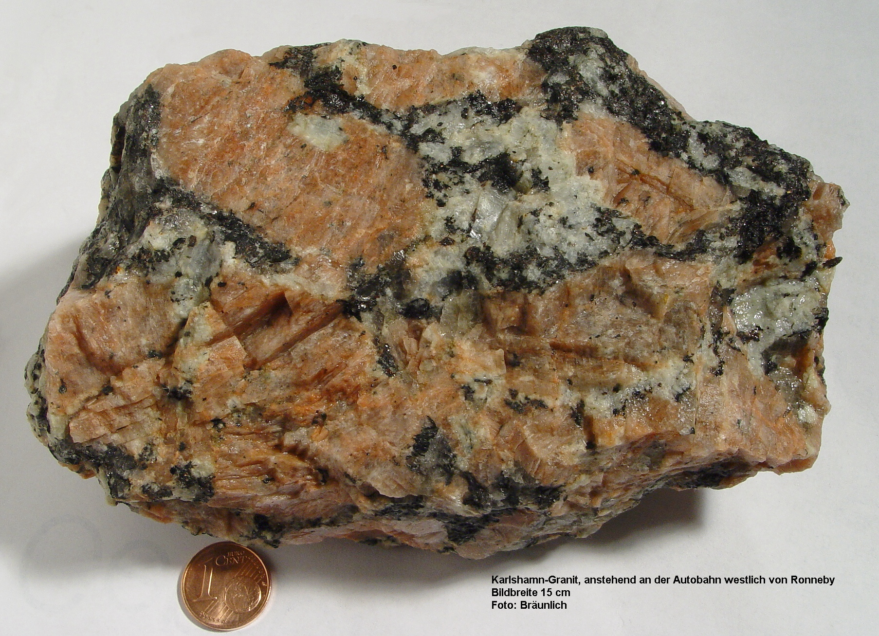 Das folgende Handstück stammt direkt vom Rastplatz an der Autobahn, knapp westlich von Ronneby. Auffällig die großen Alkalifeldspäte, typisch für Karlshamn-Granit. | |||||||||||||||||||||||||||||||||||||||||||||||||||||||||||||||||||||||||||||||