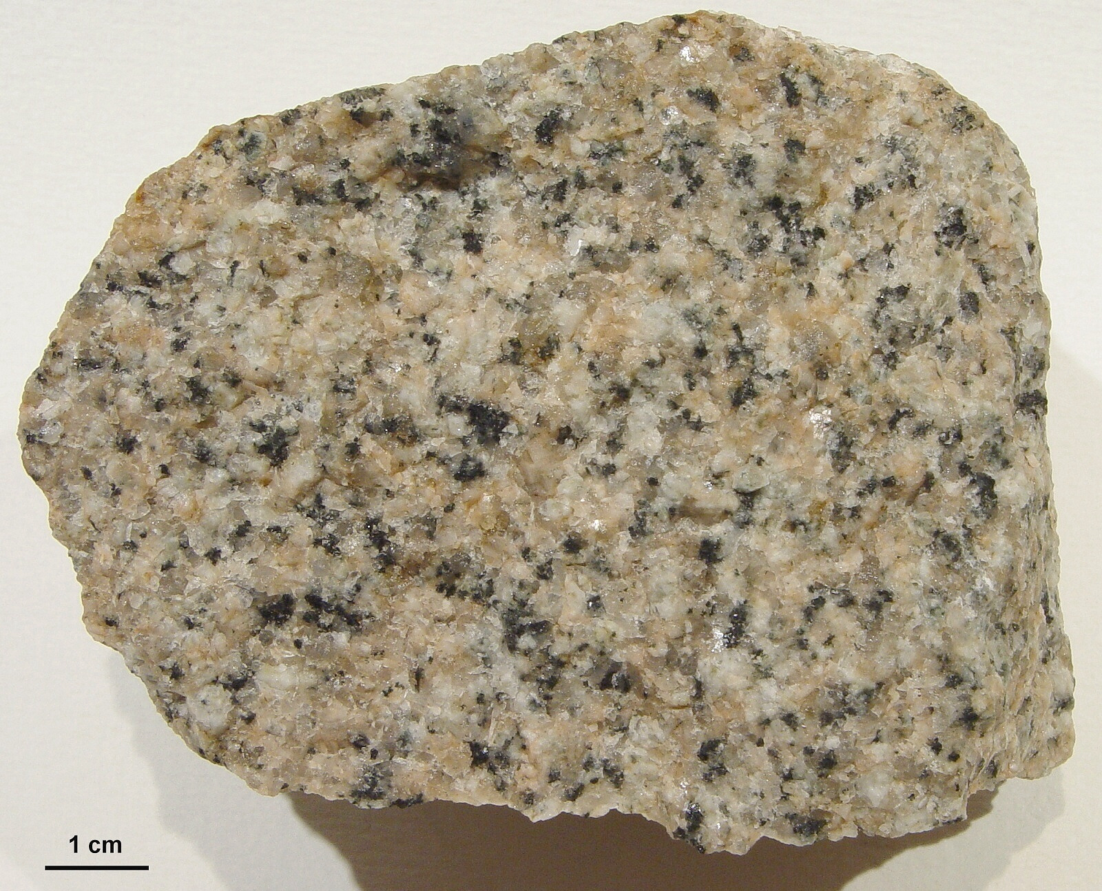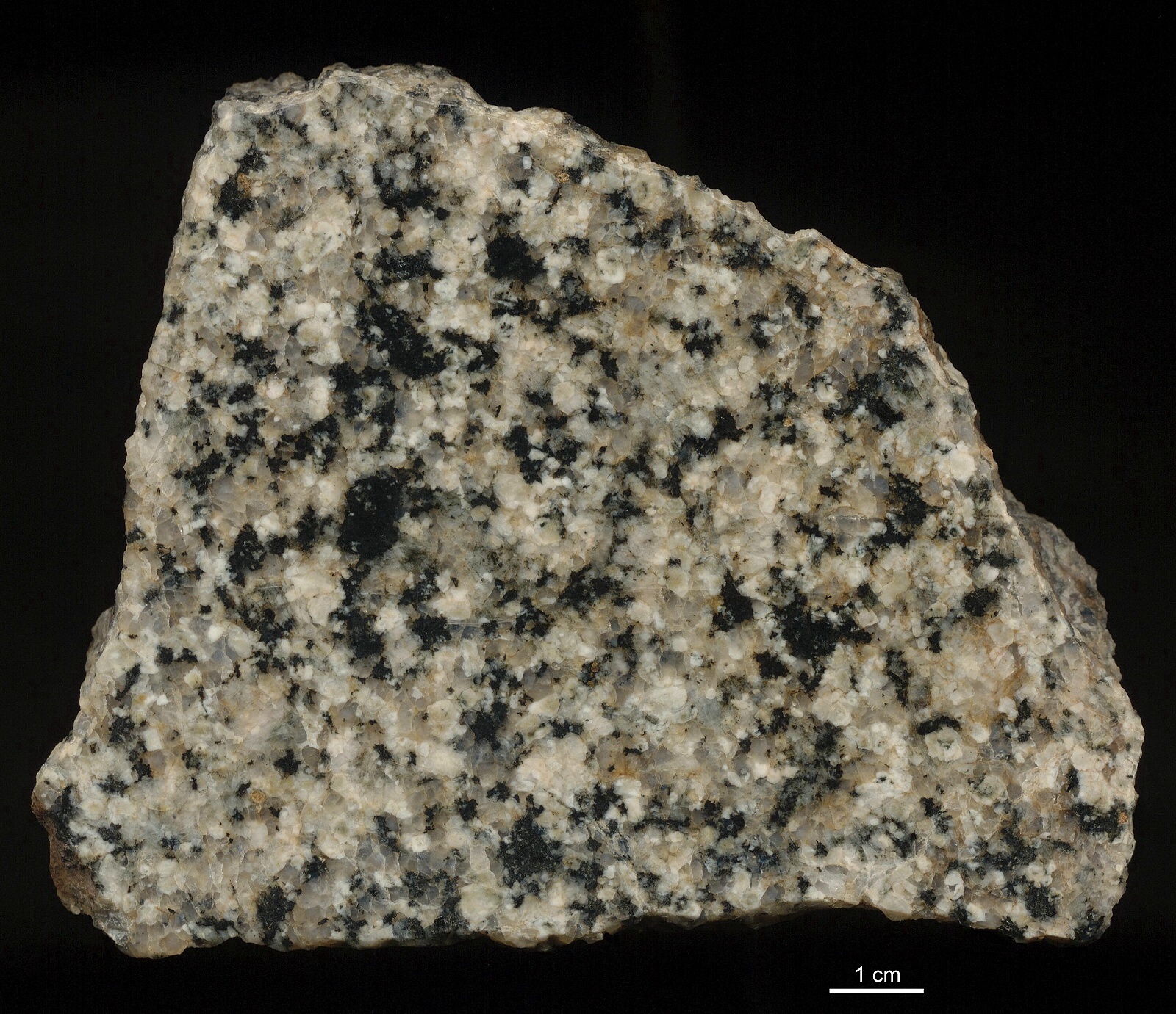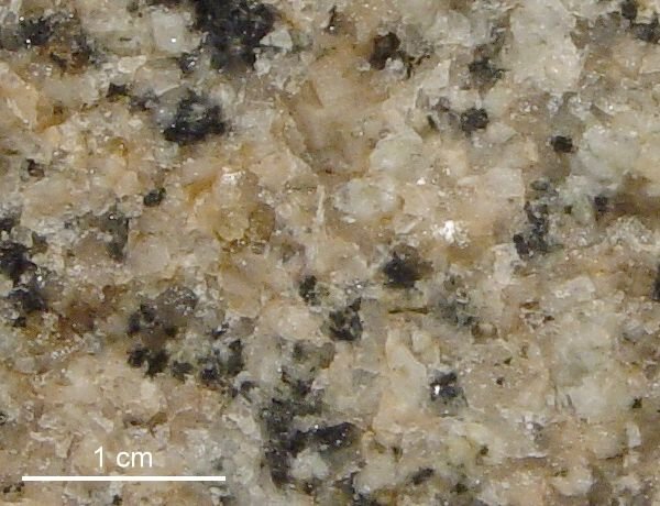Dieser Granit stammt aus dem Ort Sala und dessen näherer Umgebung. Sala liegt in Mittelschweden (Uppland). Die drei Proben, die ich hier zeige, stammen direkt aus dem Stadtgebiet von Sala und vom südöstlichen Stadtrand. Das Gestein ist insgesamt recht hell, die Feldspäte sind mehr oder weniger weiß. Wir finden viel Quarz , viel Plagioklas und etwas weniger Alkalifeldspat. Das Gestein ist mittelkörnig. Viele der Plagioklase sind idiomorph (eigengestaltig). Sie zeigen eckige Umrisse, was auf dem polierten Schnitt (ganz unten) schön zu sehen ist. Die dunklen Minerale sind überwiegend Biotit und etwas Hornblende, gelegentlich finden sich einige Erzkörner. Der Quarz ist grau bis graublau, ab und zu auch richtig blau. Das abgebildete Gestein ist richtungslos-massig, es kann aber auch deutlich eingeregelt sein. | |||||||||||||||||||||||||||||||||||||||||||||||||||||||||||||||||||||||||||||||