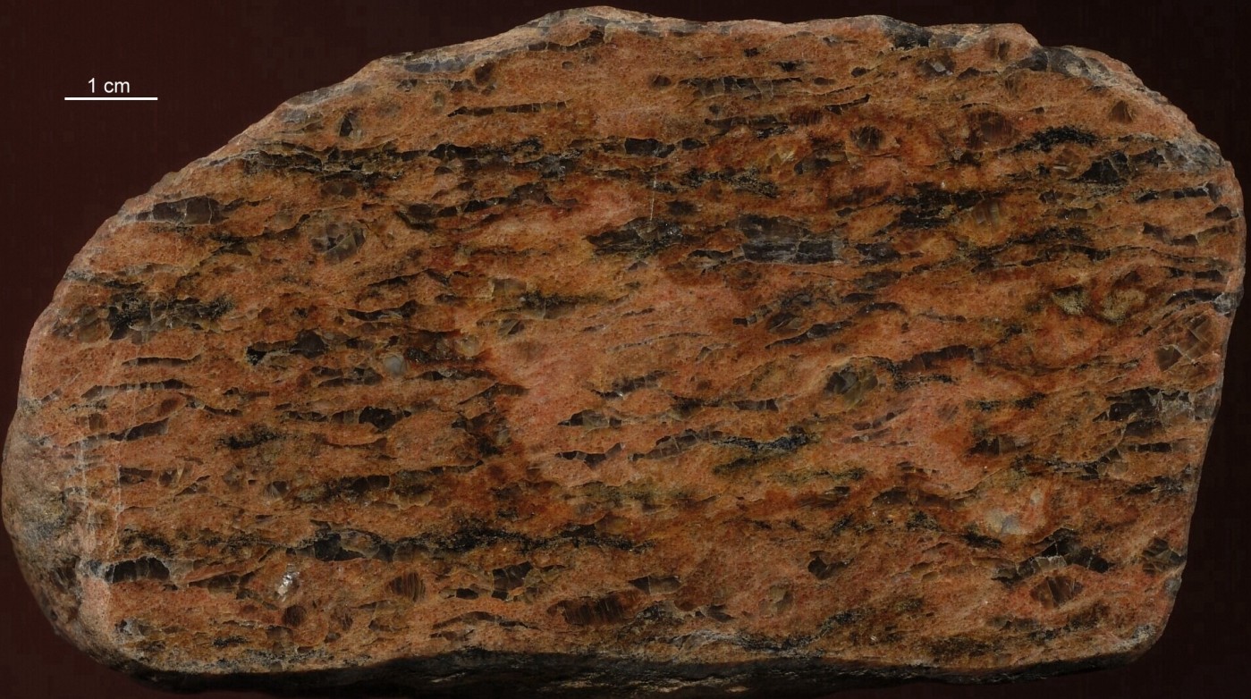 Granulite sind Gesteine, die durch Druck und erhöhte Temperaturen verändert ("metamorph überprägt") sind. Diese Umwandlungen sind am verformten Gefüge und im Mineralbestand ablesbar. Beim Schonengranulit ist es der Quarz, welchem die Aufmerksamkeit gilt. Da er als druckempfindliches Mineral seitlich ausweicht, hat er die Form flacher Linsen (oder Platten) angenommen. Je nach Blickrichtung auf das Gestein ist Form der Quarze verschieden. Schonengranulit stammt aus dem Südwesten / Westen der Provinz Schonen. Geologisch eingeordnet: Aus der südwestschwedischen Gneisregion. Dieses Gebiet wurde während der svekonorwegischen Gebirgsbildung vor ca. einer Milliarde Jahre überprägt. Allgemein sind Granulite über die Minerale und das Gefüge definiert. Die Beschränkung auf den Quarz ist normalerweise nicht ausreichend und hier nur im Bezug auf schwedische Gesteine zulässig, da Granulite im norddeutschen Geschiebe in der Regel aus dem Südwesten Schonens stammen. Granulite aus anderen Herkunftsgebieten wie zum Beispiel dem sächsischen Granulitgebirge sehen daher anders aus und enthalten auch typische Minerale der Granulitfazies (Disthen, Sillimanit etc). Ein Beispiel sehen Sie ganz unten. Das Geschiebe stammt aus Elmenhorst bei Hamburg, polierte Fläche. | |||||||||||||||||||||||||||||||||||||||||||||||||||||||||||||||||||||||||||||||