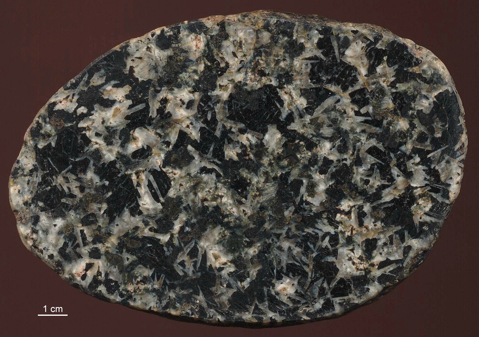 Ein Gestein aus der Basaltfamilie. Die Schmelze, aus der sich dieser Diabas bildete, kühlte langsam genug ab, um ein differenziertes Gefüge zu bilden. Als Diabas werden in Skandinavien alle Basalte bezeichnet, die ein Gefüge mit sichtbaren Kristallen ausgebildet haben. Åsby-Diabas ist nach dem Vorkommen nordwestlich vom Siljansee in Dalarna (Mittelschweden) benannt. Diabase dieses Typs kommen auch in anderen Gegenden von Schweden und Finnland vor. Daher ist er als Leitgeschiebe nicht zu verwenden. Der Name dieses Gesteins ist aber als Typenbezeichnung für die ganze Gruppe von Diabasen mit schön entwickelten Gefügen gut geeignet. Nach der heute gültigen Nomenklatur ist dieses Gestein ein Dolerit. Åsby-Diabas ist dominiert von einem regellosen Gitterwerk heller Plagioklasleisten, in deren Zwischenräumen dunkle Minerale sitzen. Die Plagioklase kristallisierten in der Schmelze zuerst aus und haben daher ihre eigene Kristallgestalt ausgebildet - sie sind idiomorph. Besonders schön treten sie auf angewitterten Oberflächen hervor. Diese Anordnung von leistenförmigen Kristallen bezeichnet man als "ophitisches Gefüge" (oder auch als "Intersertalgefüge"). Die dunklen Minerale, die sich mit den Zwischenräumen begnügen mußten, sind meist Augit, Magnetit und auch Olivin. Augit und Magnetit sind zwar beide schwarz, haben aber verschiedenen Glanz. Sie sind auf frischen Bruchflächen durchaus zu unterscheiden. Man kann auch einen Magneten nehmen: Diabase enthalten oft genügend Magnetit, um einen kleinen Dauermagneten festzuhalten. Das erste Bild zeigt ein Geschiebe aus der Kiesgrube in Groß Pampau. Oben rechts fehlt die angewitterte Kruste, daher die dunklere Oberfläche. | |||||||||||||||||||||||||||||||||||||||||||||||||||||||||||||||||||||||||||||||